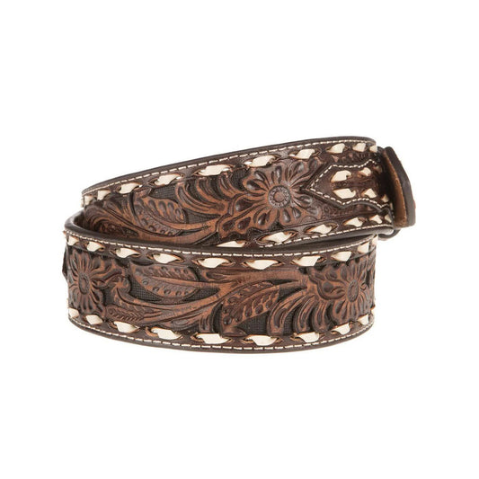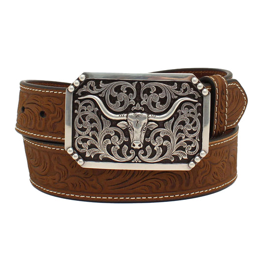 Men's Floral Embossed Longhorn Buckle Leather Western Belt