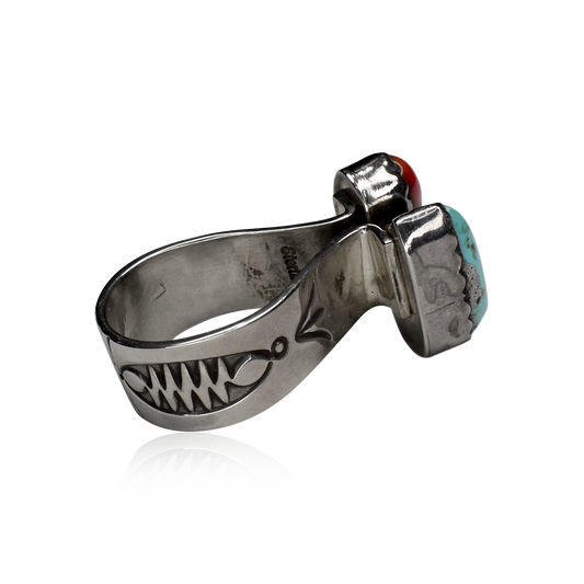 Of Two Worlds Sleeping Beauty Turquoise and Coral Split Shank Ring by Delbert Secatero