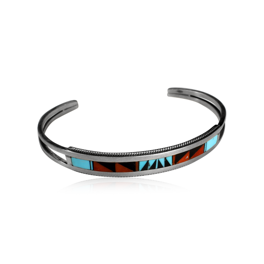 Turquoise, Lapis, and Coral Geometric Inlay Cuff by Patricia Ed Becenti