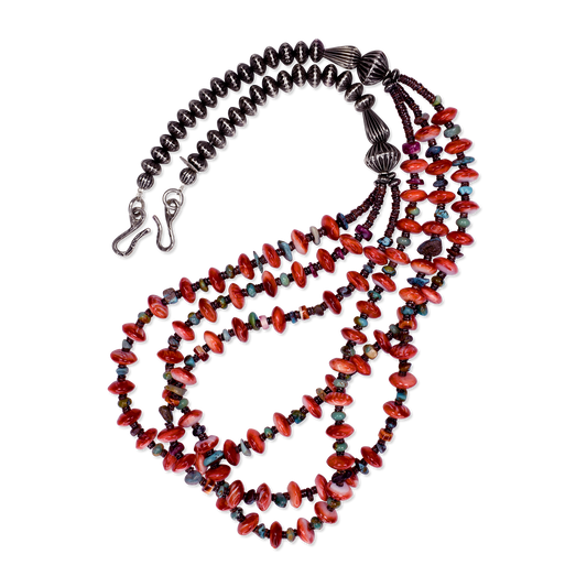 Spiny Oyster, Turquoise & Heishi Bead Necklace with Sterling Pillow Beads by Teller Indian Jewelry