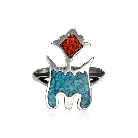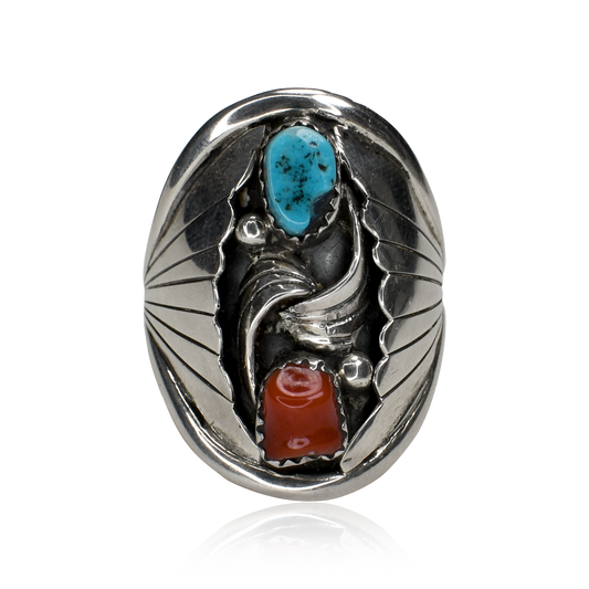 Vintage 1978 Ceremonial Eagle Indian Mountain Turquoise and Coral Chip Inlay Ring