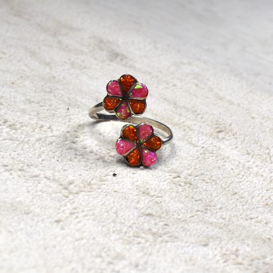 Adjustable Pink and Orange Opal Double Daisy Ring