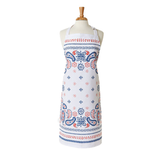 This classic American style apron is your go-to for all your cooking, grilling and baking needs. The red, white and blue paisley bandana print represents the colors of the USA, making it perfect for any holiday celebration. Get ready to show your national pride in style.