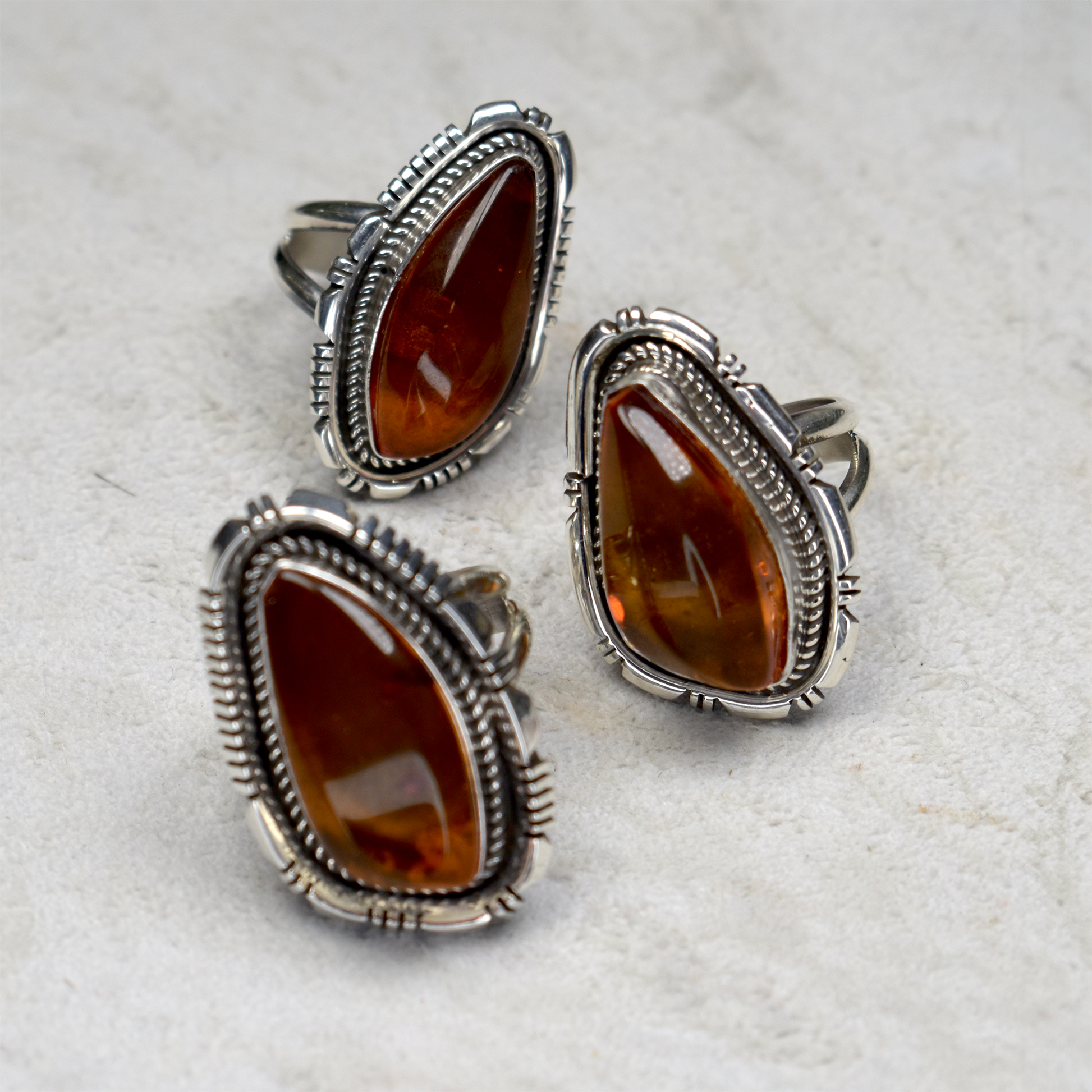Experience the unique beauty of our Asymmetrical Amber Ring by Glenn & Irene Sandoval. The polished amber stone boasts stunning variations, while the hand-tooled setting features a charming rope border and intricate hand-sawed details. The sturdy double pronged band adds both style and security. Its earth tones make it the perfect complement to turquoise jewelry.