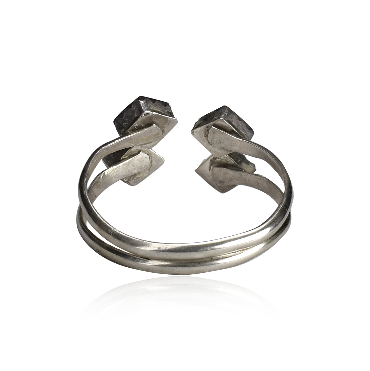 Bold, modern, and mesmerizing—this handcrafted ring features four diamond-cut Blood Red Opals arranged in a dynamic, open-band design. Each opal shimmers with fiery flashes of crimson, orange, and green, creating a dramatic play of color that shifts with every movement. The stones are set in sturdy prong settings atop a double-band sterling silver frame, giving the piece a geometric elegance that feels both contemporary and timeless.