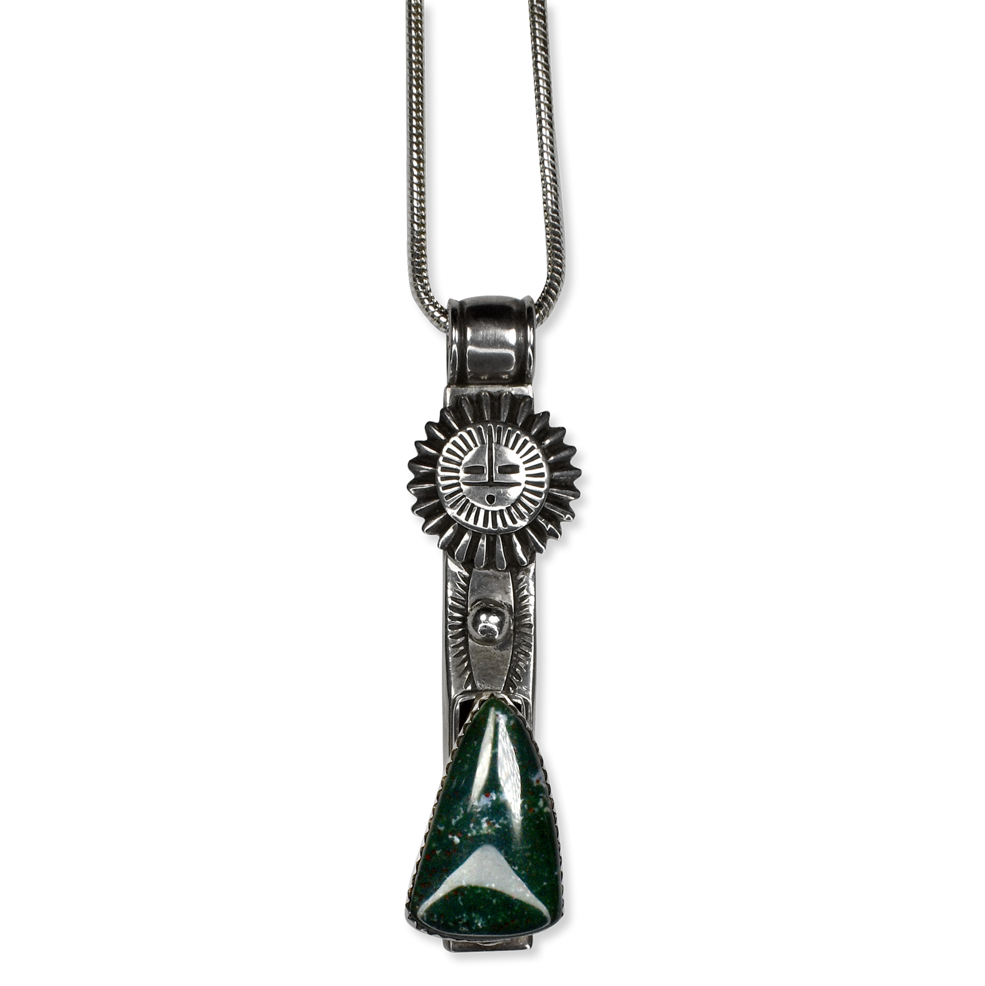 Handcrafted by Navajo silversmith Roger Nelson, this striking pendant honors both craftsmanship and symbolism. The design centers on a radiant Sunface motif, a traditional emblem representing harmony, balance, and the life-giving power of the sun. Below it rests a dramatic Bloodstone cabochon, rich in deep forest green with natural splashes of white and red. Known historically as a stone of courage and renewal, Bloodstone is valued for its grounding energy and painterly beauty, each one as unique as a desert landscape at dawn.