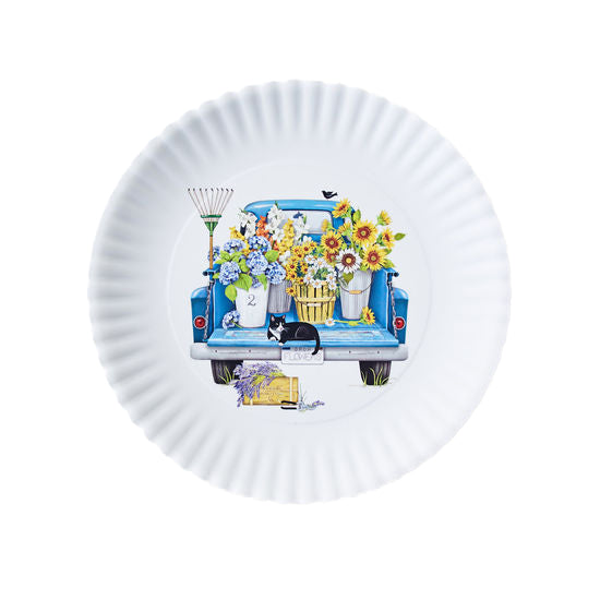 Let your meal times be as charming as can be with this platter! Perfect for both indoor and outdoor use, it is reusable, as well as vibrant and unique, featuring a happy little farm truck that will make every meal time special.