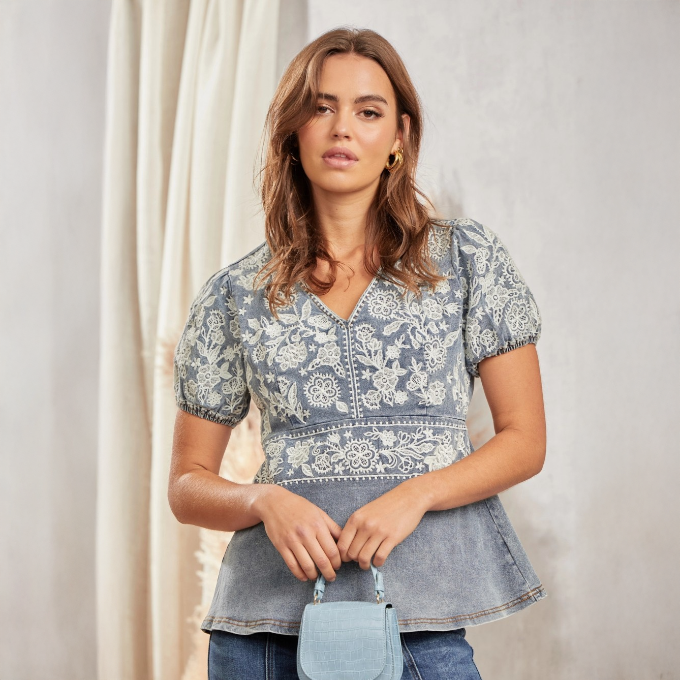 Soft denim meets Sunday romance in the Bluebonnet Waltz Top—a poetic blend of structure and sweetness. Delicate white floral embroidery dances across puffed sleeves and down to the waistline, while the gently flared hem adds just the right amount of movement. With its flattering V-neckline and subtly tailored fit, this top brings charm to everything from denim cutoffs to wide-leg trousers.