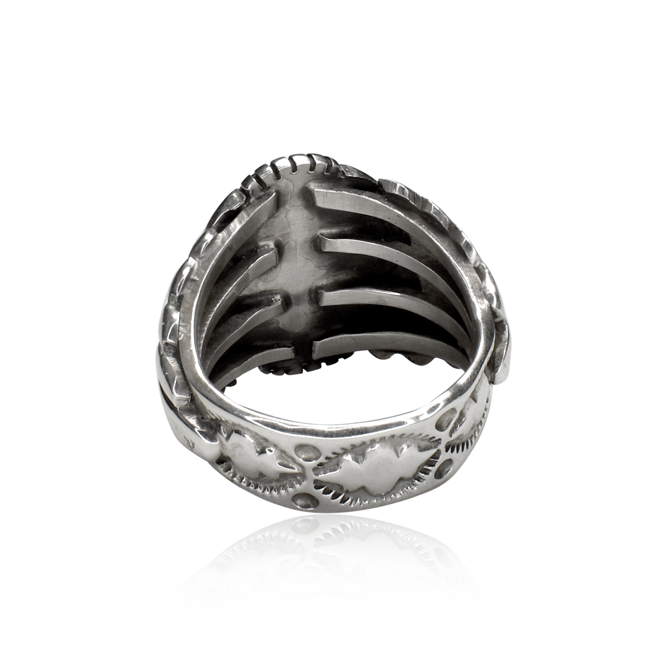 Set in a finely twisted rope bezel, the turquoise is cradled by a wide, hand-tooled silver band adorned with traditional stampwork. Each mark is deeply etched, forming a rhythmic pattern that evokes the natural harmony of desert landscapes and tribal artistry. The band tapers gently for comfort, while maintaining a bold presence on the hand.