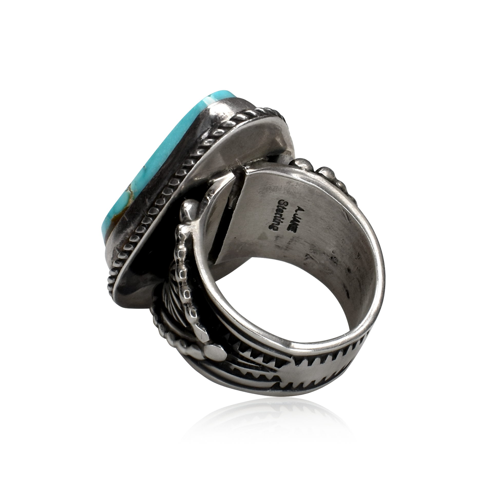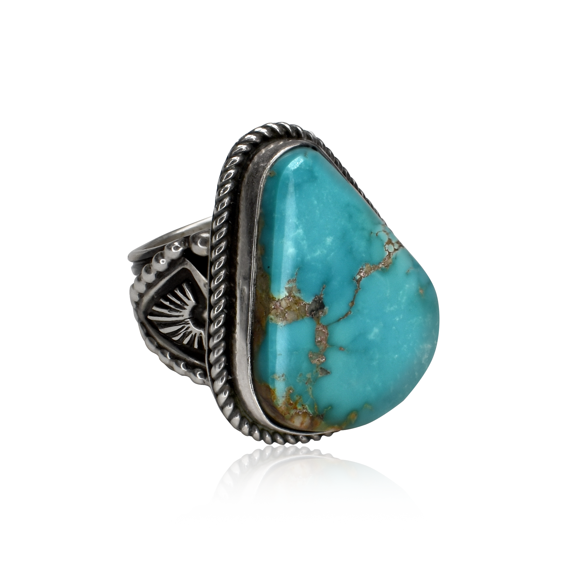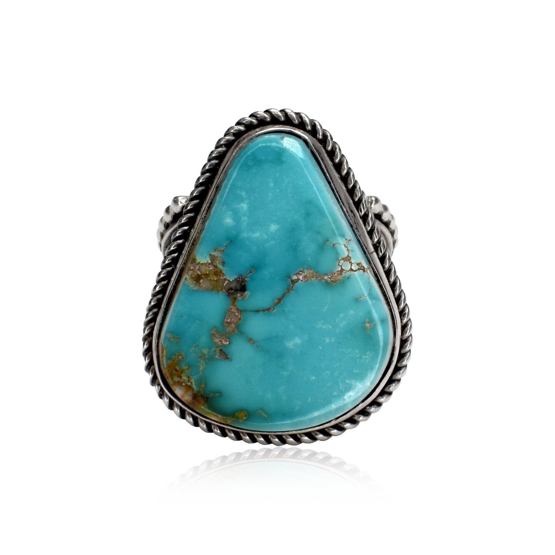 Handcrafted by renowned Navajo silversmith Albert Jake, this ring captures the spirit of the Southwest with bold artistry and timeless design. The large, teardrop-shaped Kingman turquoise stone features a serene sky-blue hue veined with golden matrix, framed by a finely twisted sterling silver rope border and detailed overlay band.