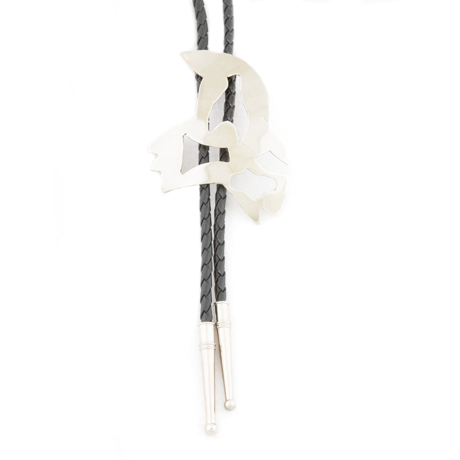 This Eagle in the Clouds Navajo Bolo is a stunning piece of craftsmanship. It features a hand-designed, tooled, and crafted polished sterling silver soaring eagle with intricate cutouts, making an eye-catching statement. The bolo tips and the classic black leather braided cord are the perfect accents to complete the eye-catching look.