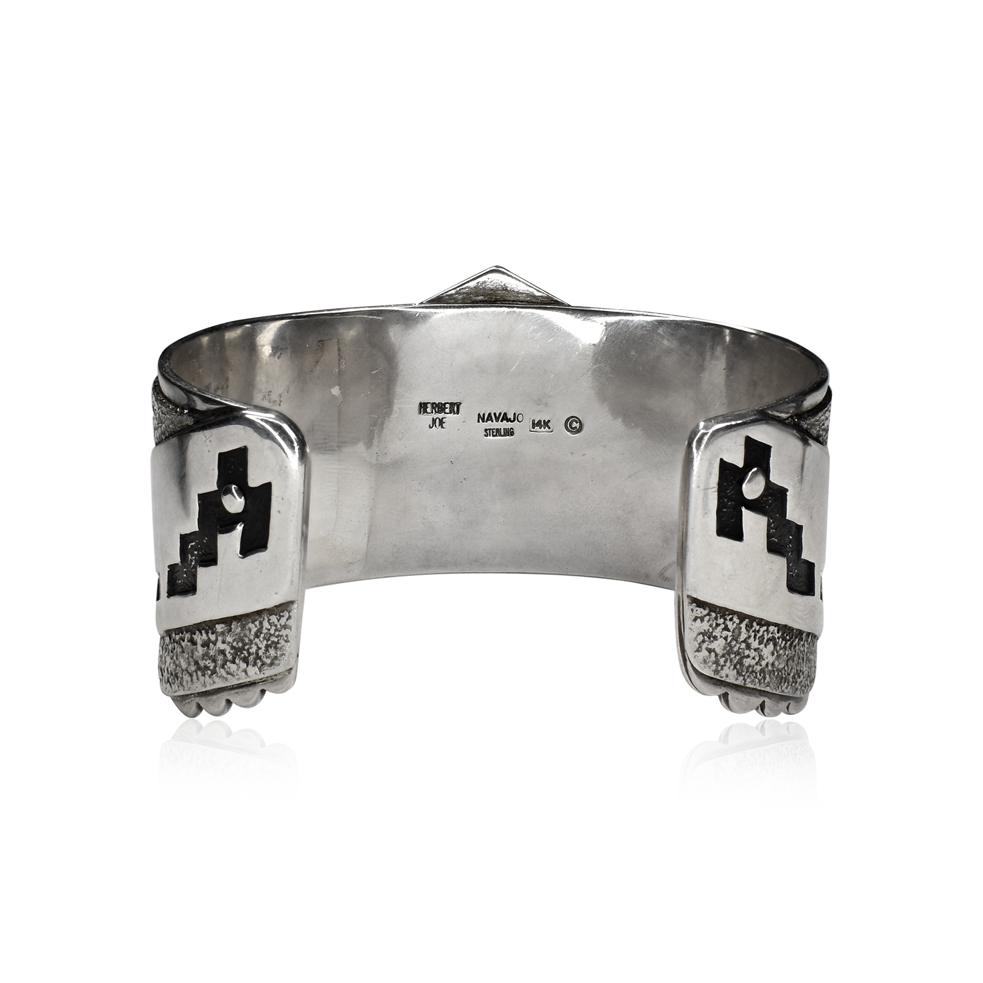 The Elemental Path Cuff is a striking, handcrafted piece by Herbert Joe, a Navajo silversmith whose work blends traditional motifs with bold, contemporary textures. This cuff is made from solid sterling silver and accented with 14K gold, as confirmed by the hallmarks stamped inside: “Herbert Joe,” “NAVAJO,” “STERLING,” and “14K.” These marks affirm both the authenticity and cultural origin of the piece.