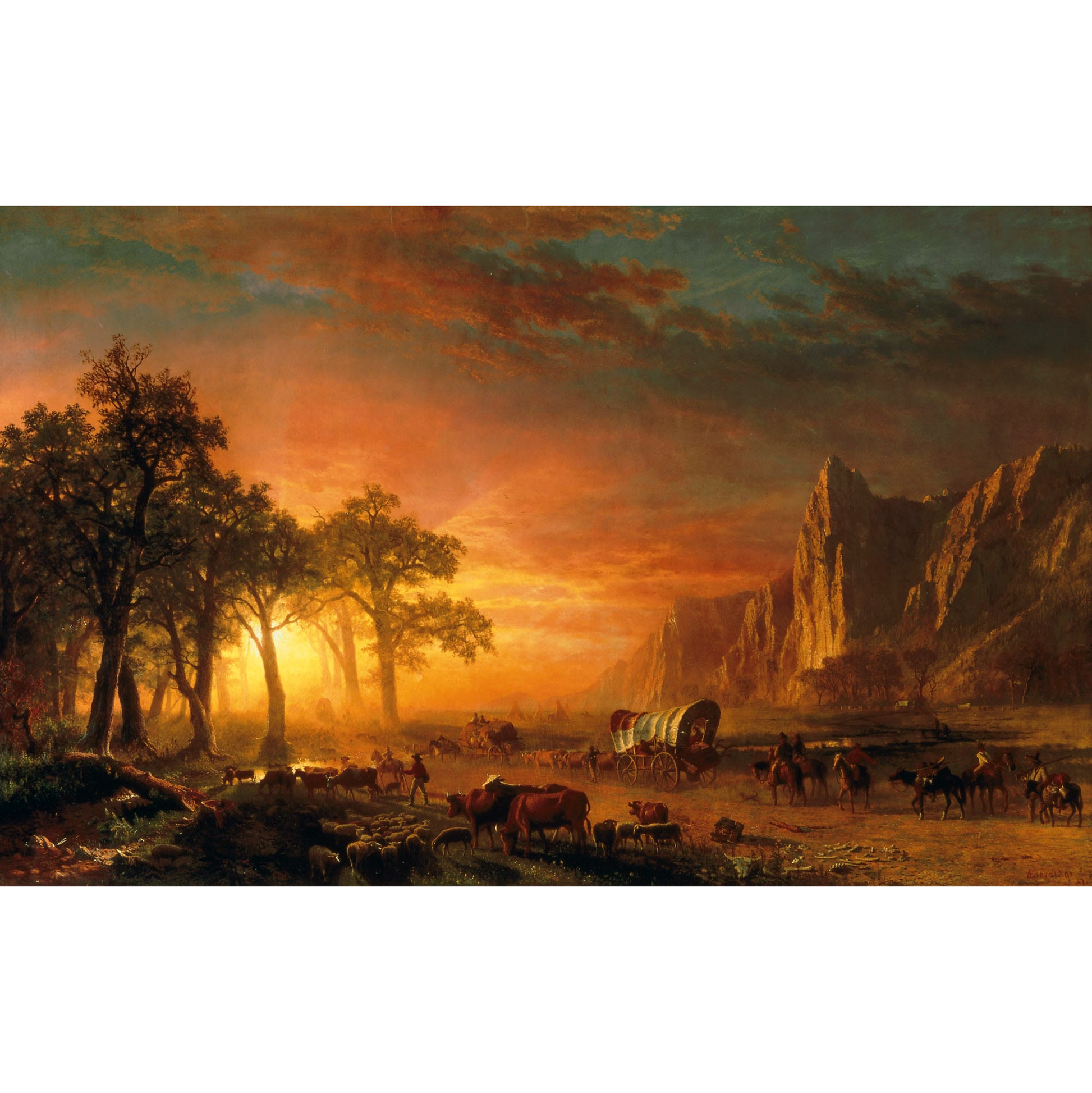 The image portrays the migration of pioneers into the West along the Oregon Trail. Taking place in the mid 19th century, this is one of the most stirring chapters of foundational American history, and is evoked in the famous phrase, 'Go West young man, and grow up with the country.'