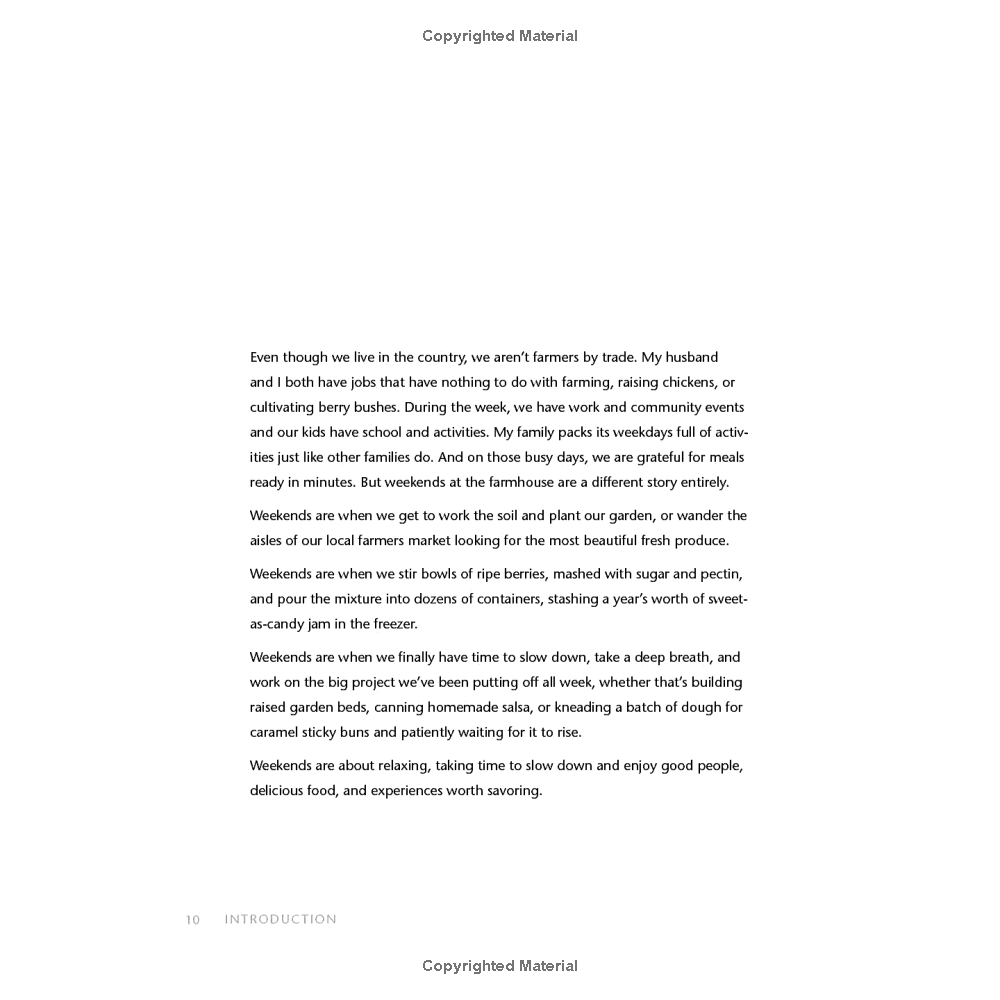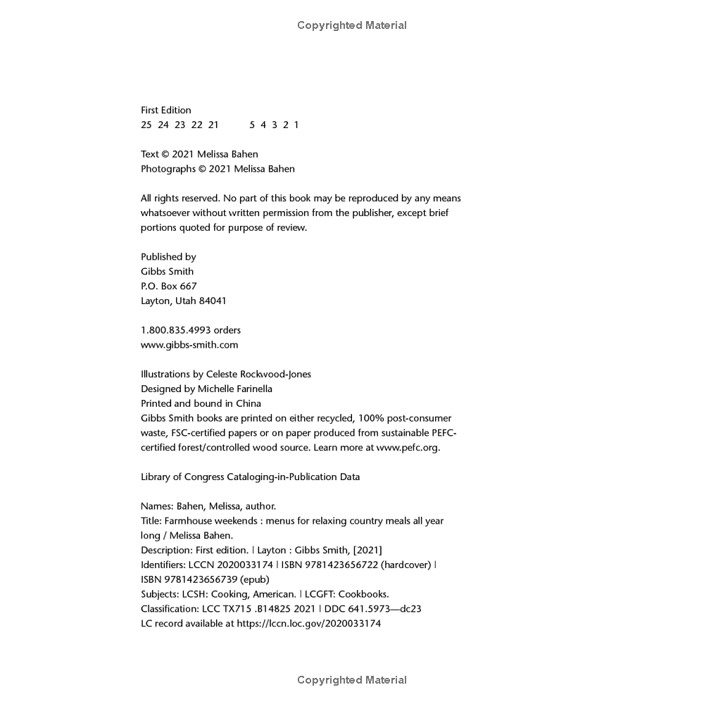 Farmhouse Weekends is the cookbook for anyone who daydreams of country life. Prepare meals and experiences to enjoy in the easy companionship of family and friends―everything you need to create the perfect farmhouse weekend, no matter where you live, is found within these pages. Each chapter provides recipes inspired by author Melissa Bahen’s weekend jaunts in the country: apple cider donuts and white bean chili after a day of picking fresh apples in the fall; buttery cobbler full of ripe, summer berries after a trip to the farmers’ market; hot, flaky biscuits slathered with butter and homemade strawberry freezer jam to start out a spring day. You’ll find brunch, dinner, and dessert recipes for spring, summer, autumn, and winter: 65 recipes to entertain and enjoy good company all year round.
