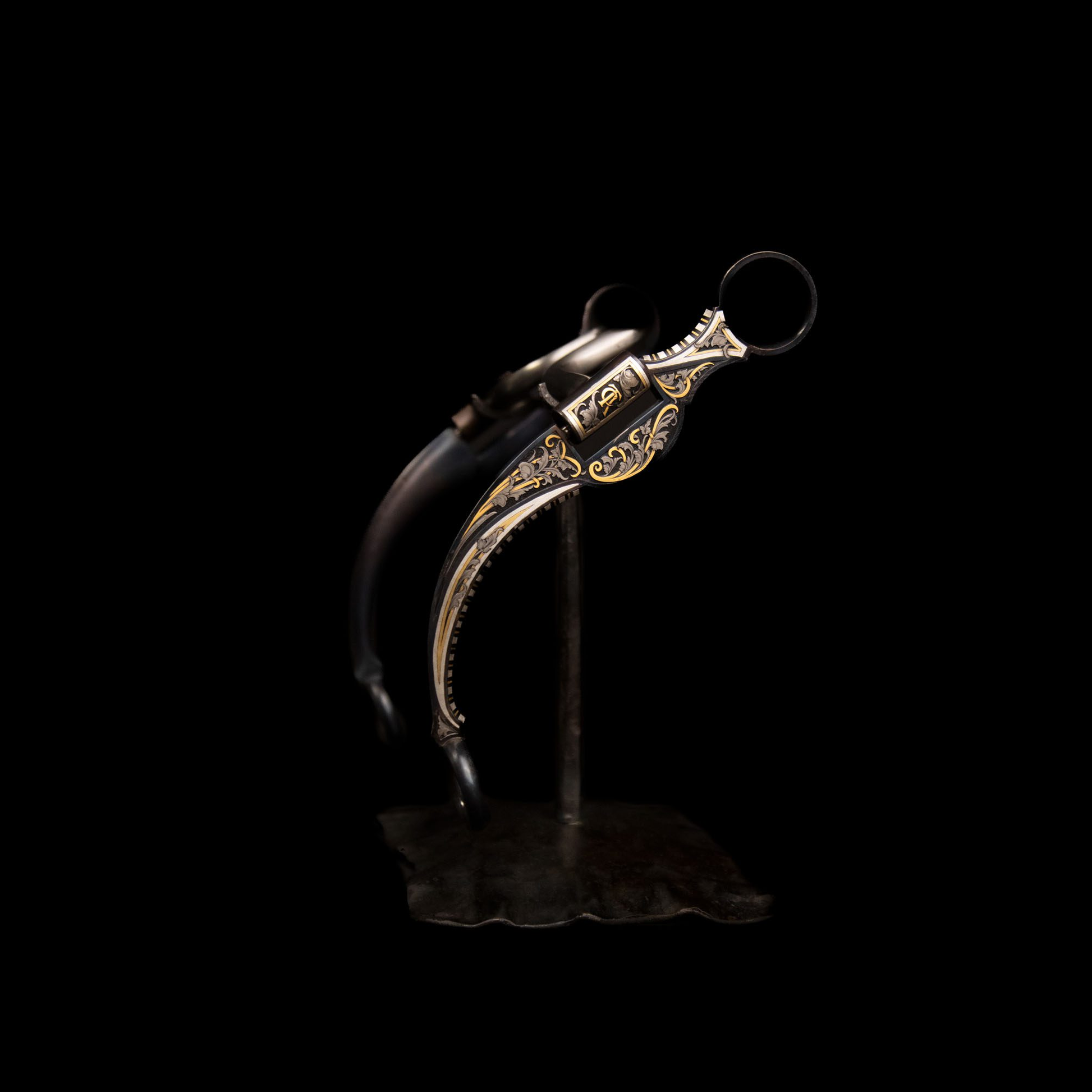 With the Futurity Bit, Capron was interested in turning a solid, proven bit into something that stands apart — not just in how it looks, but in how it rides. The shanks, Capron said, are drawn from a well-known pattern introduced by his friend, Jim Edwards, while the mouthpiece is a variation on a trusted and widely used design that Capron’s mentor, TCAA emeritus bit & spur maker Greg Darnall, has produced for years. Then, to bring his own story to the mix, Capron added relief-engraved scrolls and 24K gold inlays. The bit also features fine silver and 24K gold pinstripes that frame the work and give it balance. The result, Capron said, is a bit that catches the eye while staying true to its purpose.