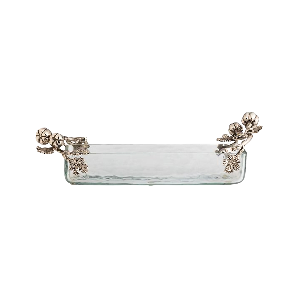 Elevate your autumn gatherings with this exquisite Pumpkin Cracker Dish, a perfect blend of elegance and functionality. Crafted from high-quality glass, this dish showcases a sleek, elongated design measuring 3 1/2" x 13", ideal for serving an array of crackers, snacks, or hors d'oeuvres. The standout feature is its beautifully detailed cast aluminum pumpkin side handles, adding a touch of seasonal charm and sophistication to your table setting. Whether you're hosting a festive dinner or enjoying a cozy night in, this dish is sure to impress your guests and enhance your dining experience. Its durable construction ensures long-lasting use, while the artistic design makes it a delightful centerpiece for any occasion.
