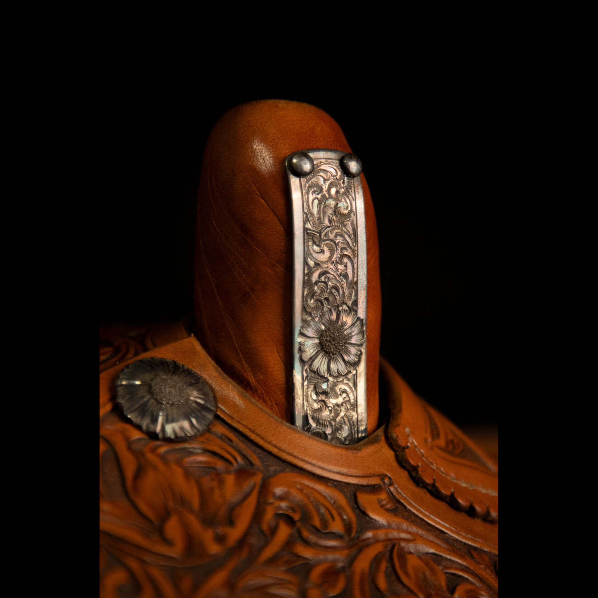 Willemsma’s half-scale Western side saddle is built to the design Charles Goodnight commissioned for his wife in 1870. The fine mixed flower carving is complemented by silver trim created by TCAA silversmith Scott Hardy. The saddle is completely hand sewn with European linen thread at ten stitches per inch.
