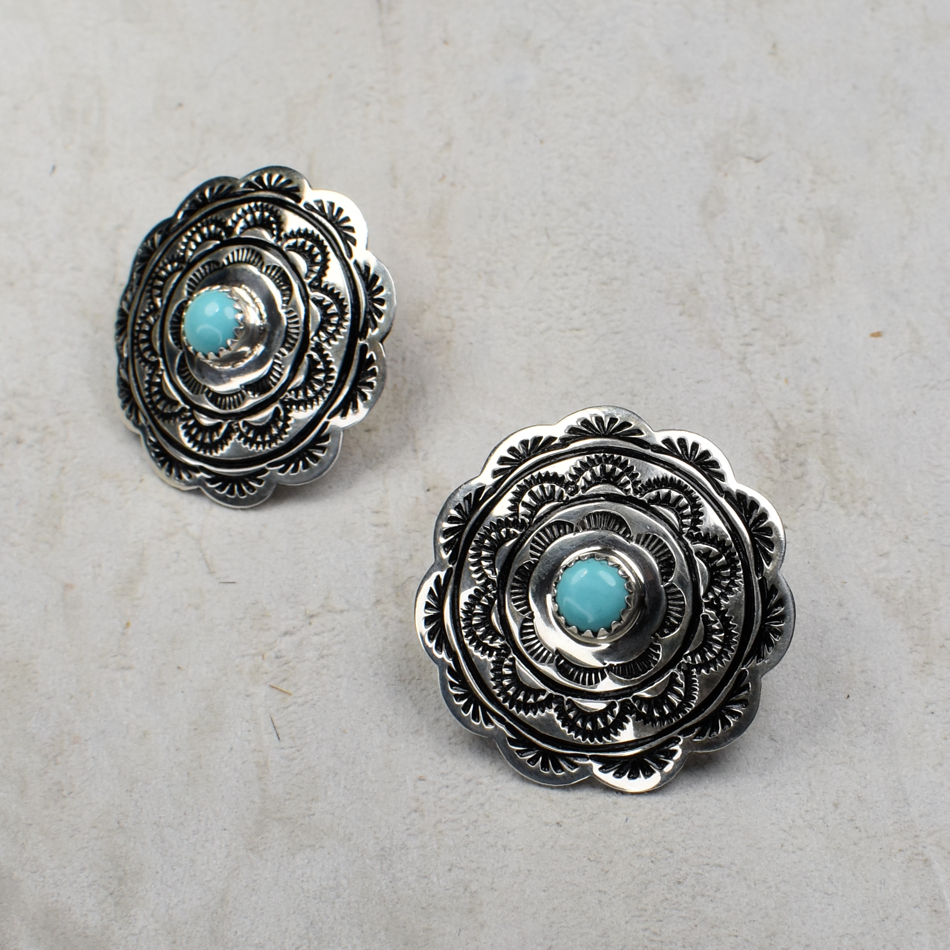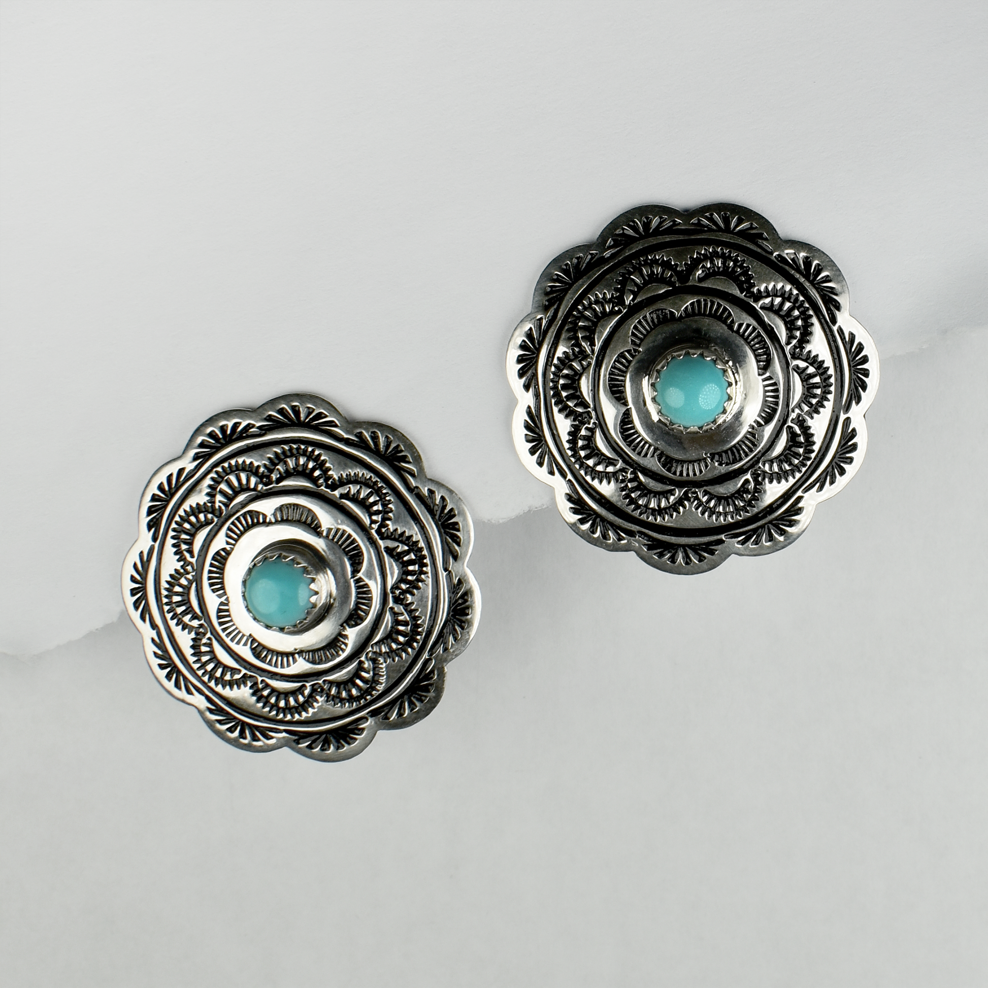 Hand-Stamped Concho Earrings with Sleeping Beauty Turquoise Inlay by Emily Arviso