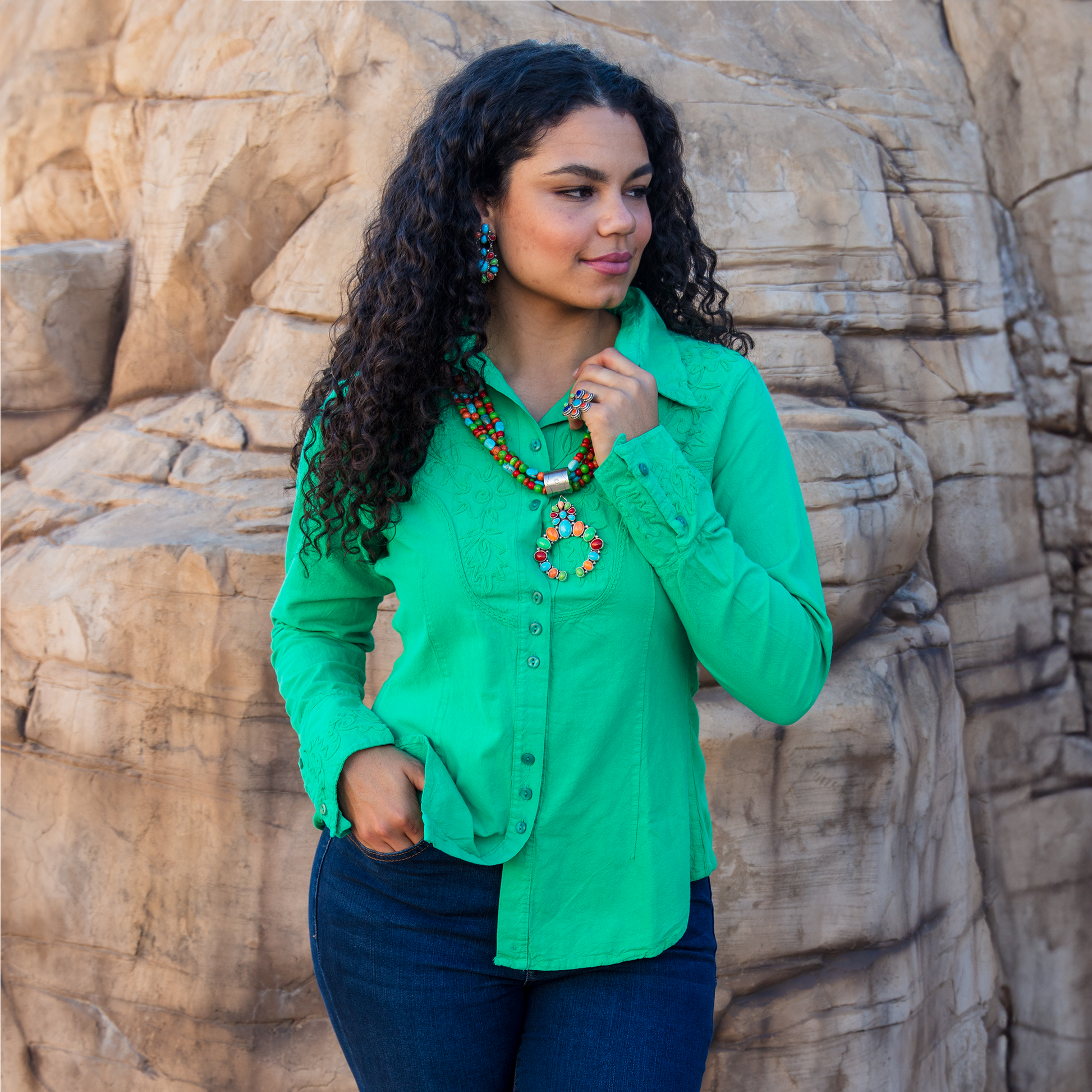 Experience classic femininity in our Inca Cottons Floral Embroidered Button-Up Shirt. With a beautifully detailed floral embroidery, this bright green long sleeved shirt provides a touch of elegance to your wardrobe. Its classic fit flatters your figure and the two buttons at the cuffs add subtle charm.