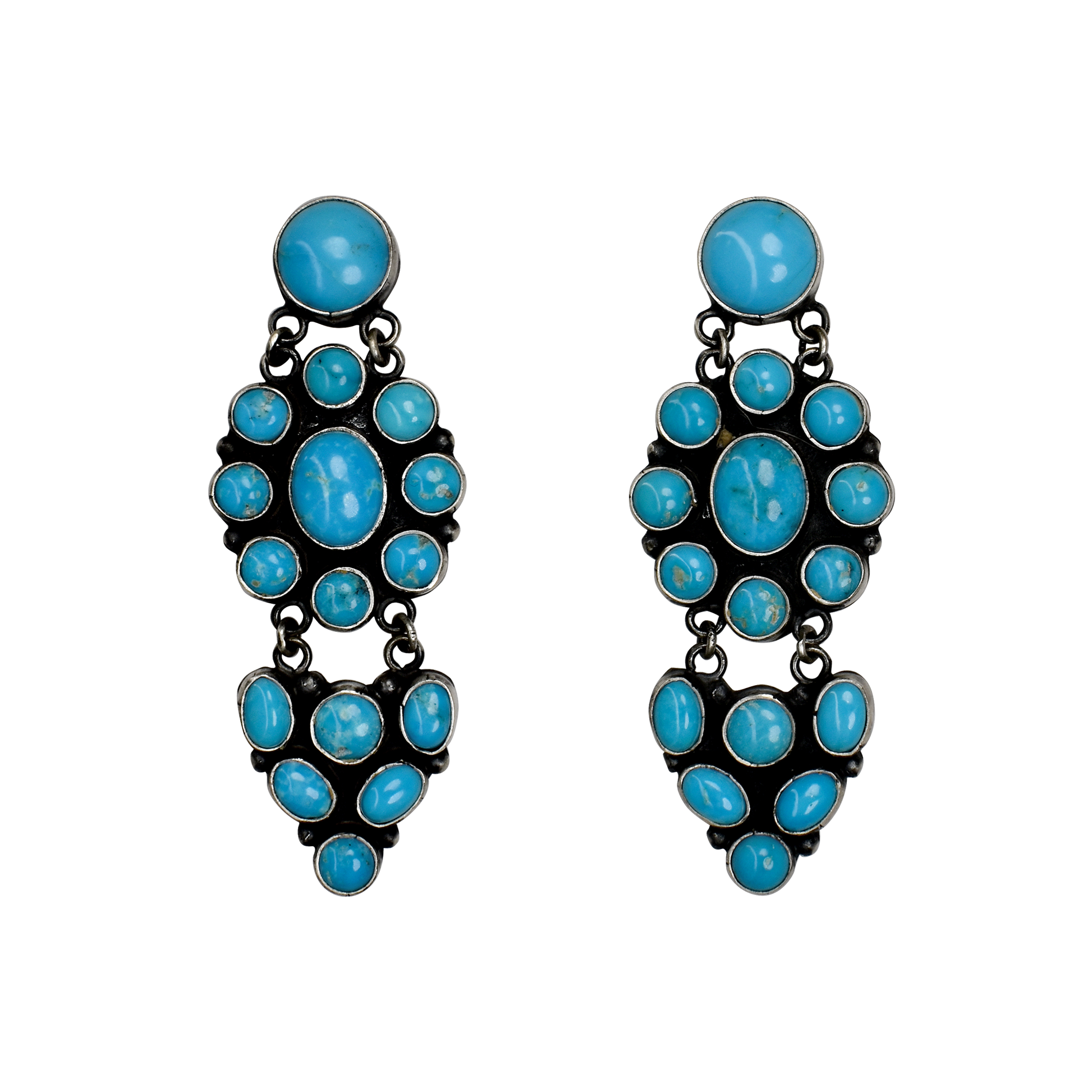 These gorgeous articulated turquoise earrings feature circular top studs and dangling triangular and flower-shaped pieces. With a show-stopping design and playful touch, these earrings are sure to make a statement.