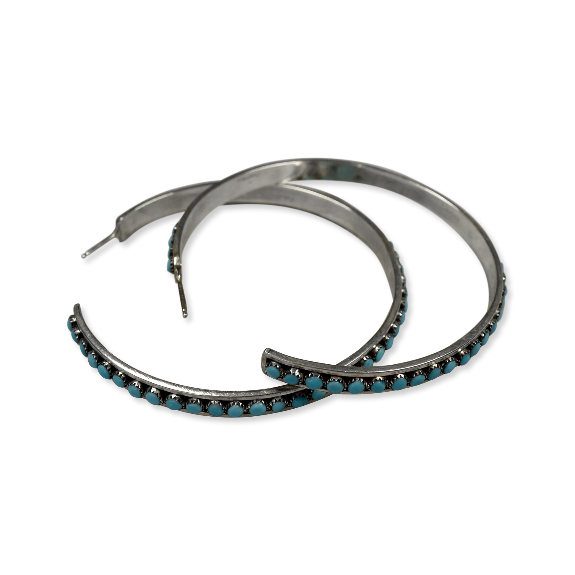 These Large Sleeping Beauty Turquoise Snake Eyes Hoop Earrings by Lois Tzuni offer a delightful blend of luxury and sophistication to any look. Crafted with 49 delicate stones and post backs, this pair of exquisite large hoop earrings adds a touch of femininity to all ensembles. The rich Sleeping Beauty Turquoise hue adds an air of exclusivity, creating a timeless accessory to elevate your everyday style.