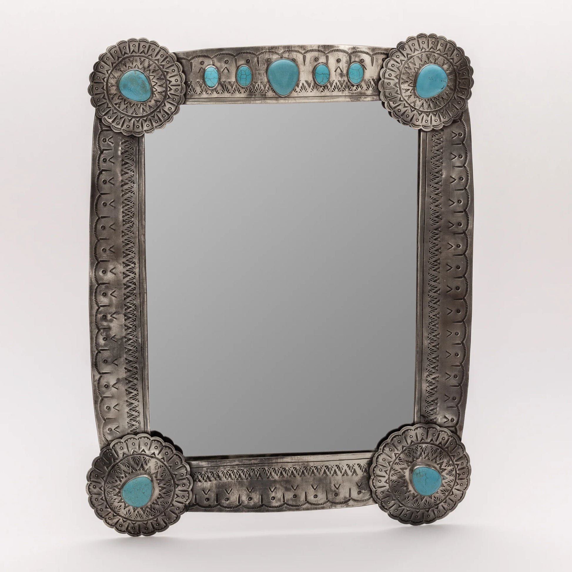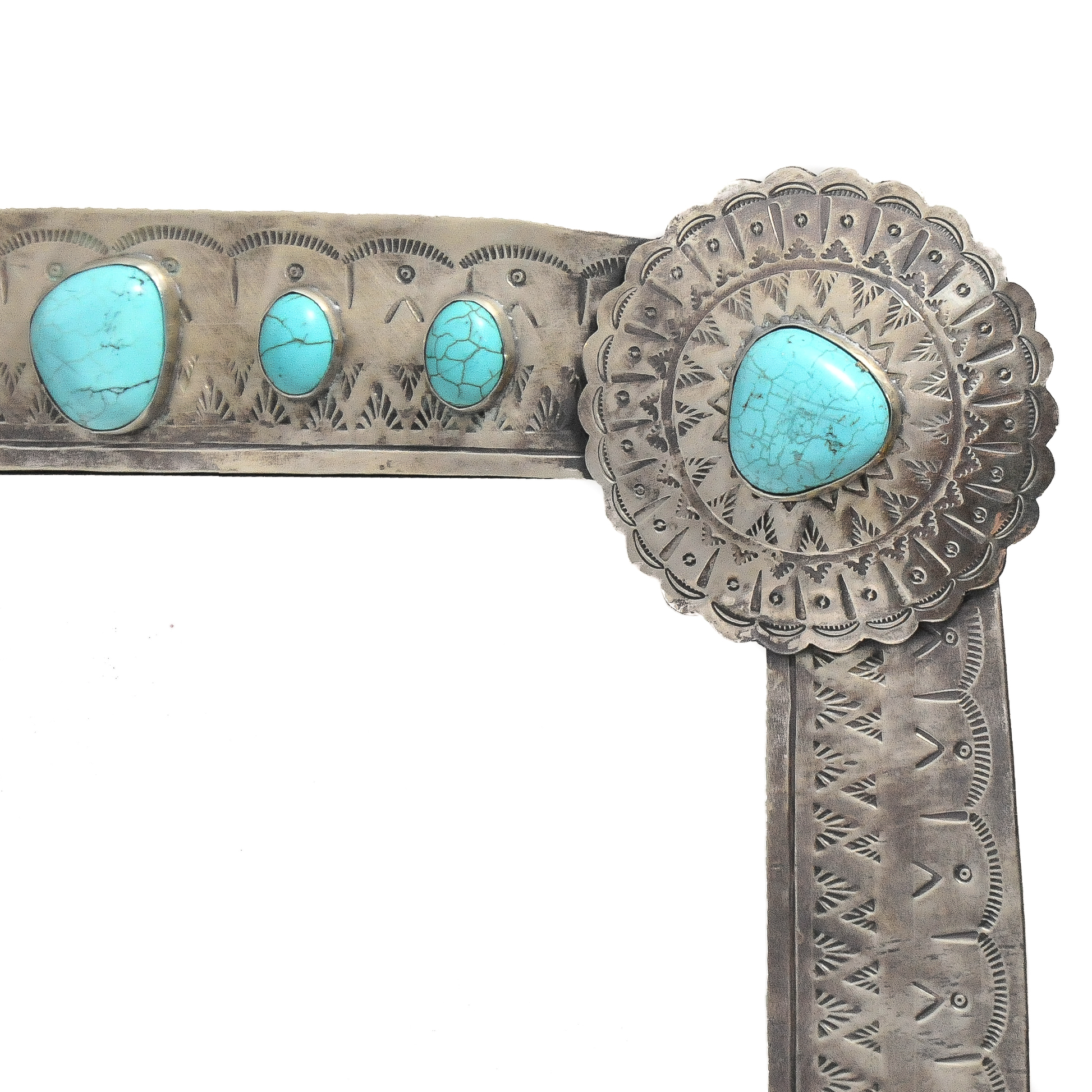 Large Stamped Vanity Mirror with Turquoise by J. Alexander Rustic Silver