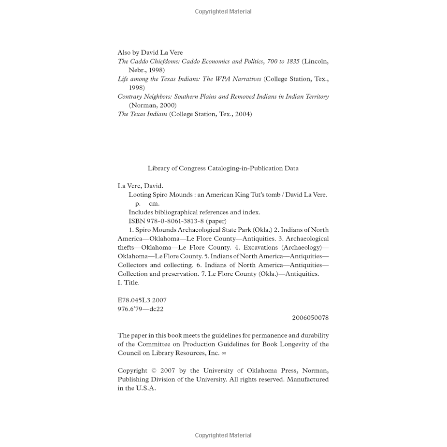 The Spiro Mounds contained some of the most impressive pre-Columbian Indian art ever found. In Looting Spiro Mounds, David La Vere takes readers behind the scenes of this discovery to re-create a Great Depression–era archaeological adventure worthy of Indiana Jones.