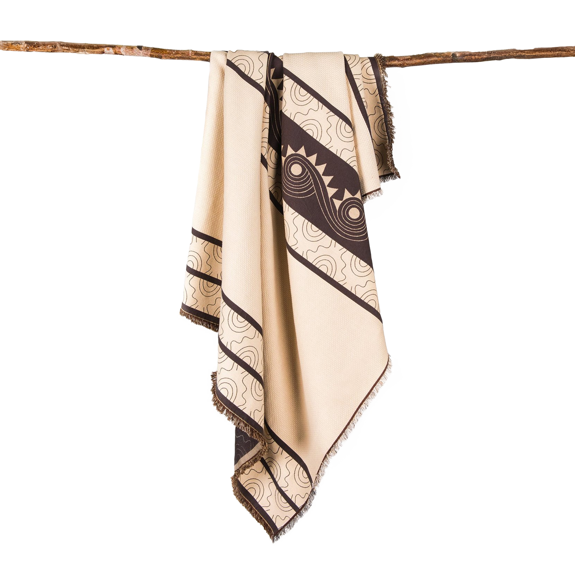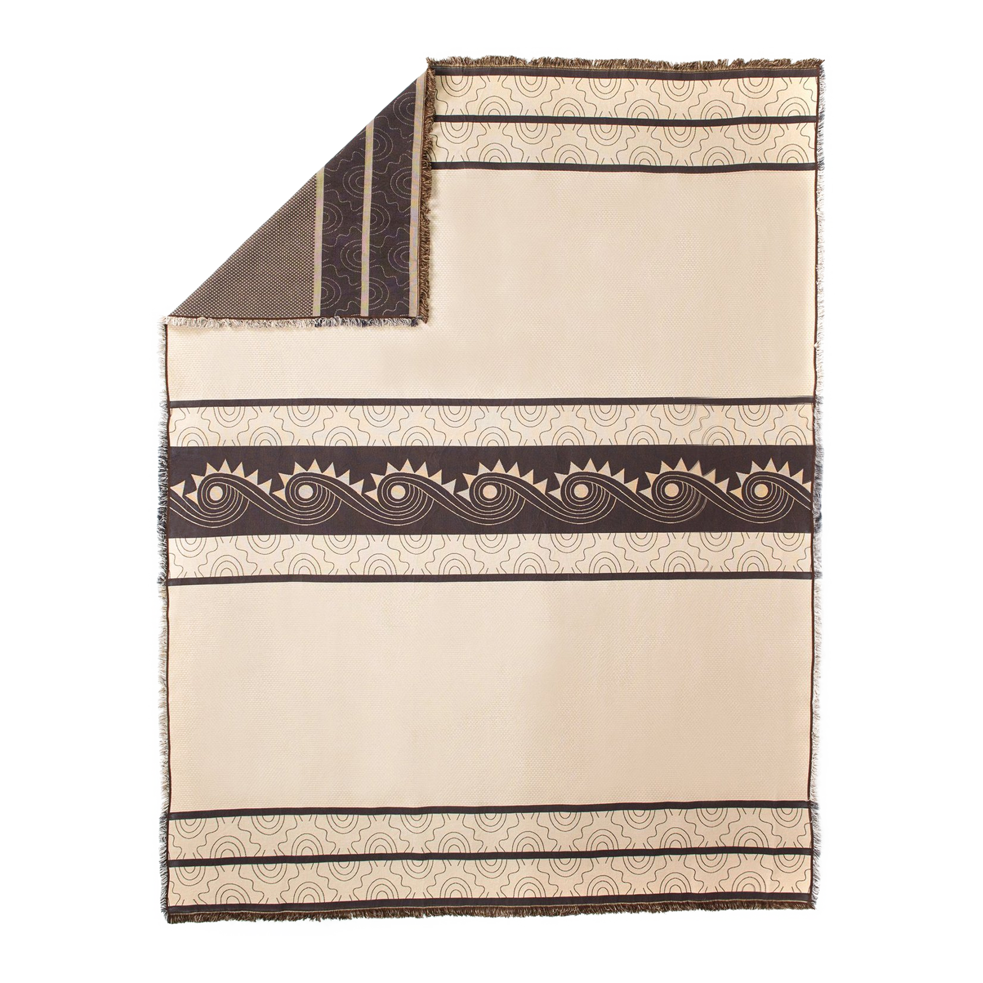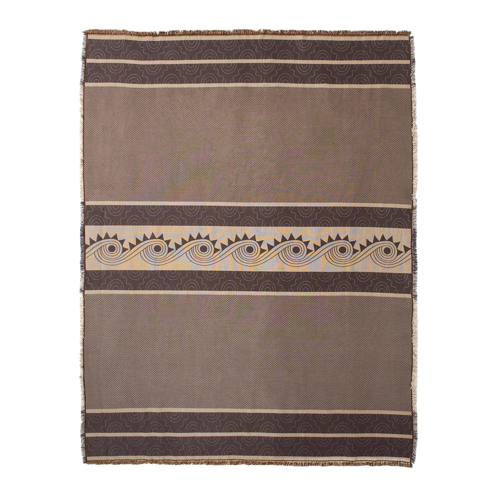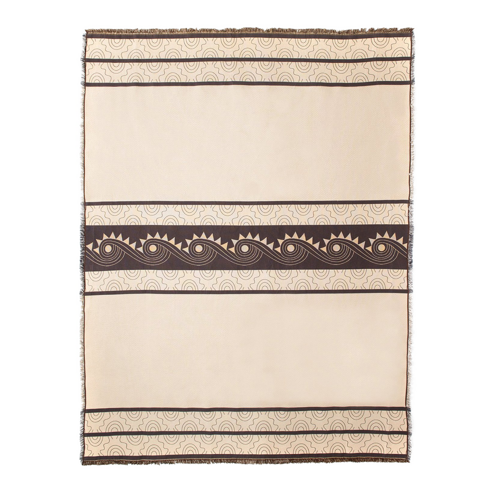Sweeping across the center of the blanket is Wind, Mahli, bringing both the fluid curvatures of change and the sharp edges of the unexpected, an integral revival of ancient motifs of Chickasaw mound builders.