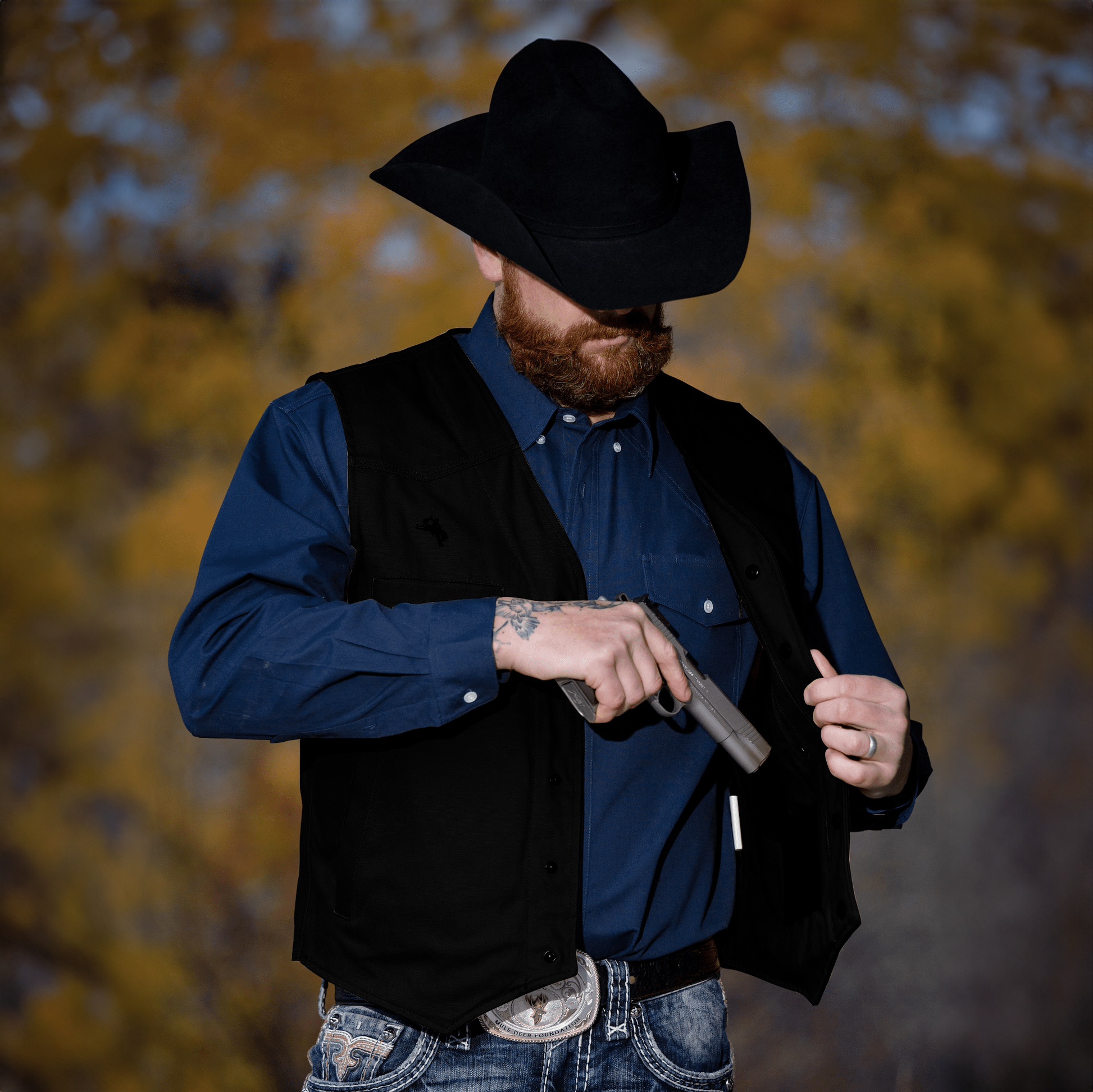 Wyoming Traders Texas Concealed Carry Canvas Vest is made from 12 ounce top quality cotton canvas with reinforced stitching throughout the vest. This vest has a front western yoke shoulder design giving it a striking look and it is great for warm weather. The top quality Wyoming Traders snaps are an important part of this concealed carry vest that has two inside adjustable holsters, four magazine clip holders and two wallet pockets with zipper closures. The front of the vest has two hand pockets at the waist and two chest pockets all lined with our polyester satin. Interested in Leather see our Drover Concealed Carry Vest.
