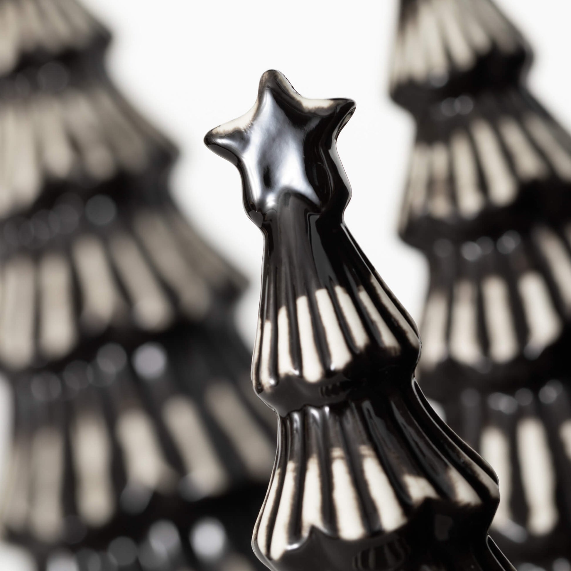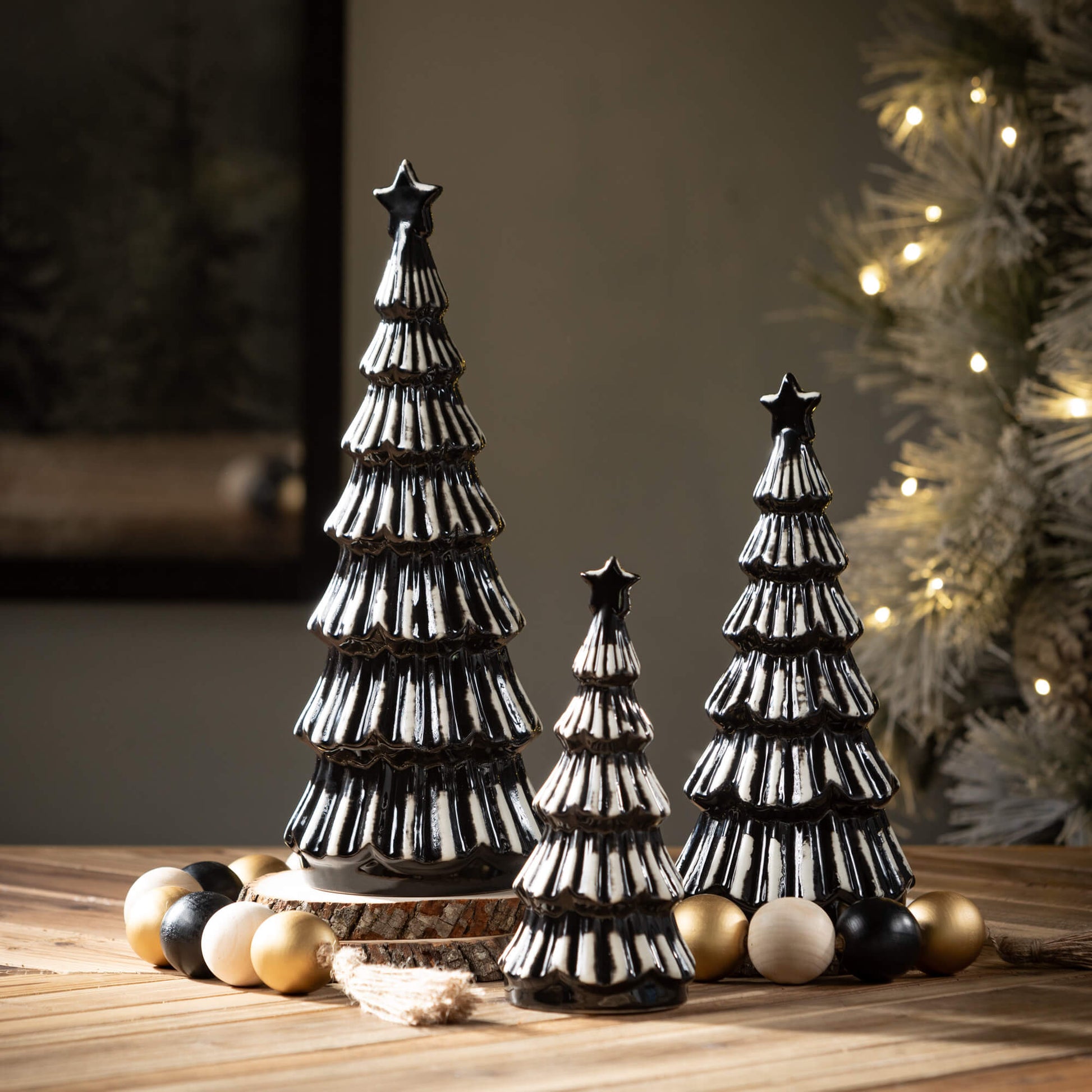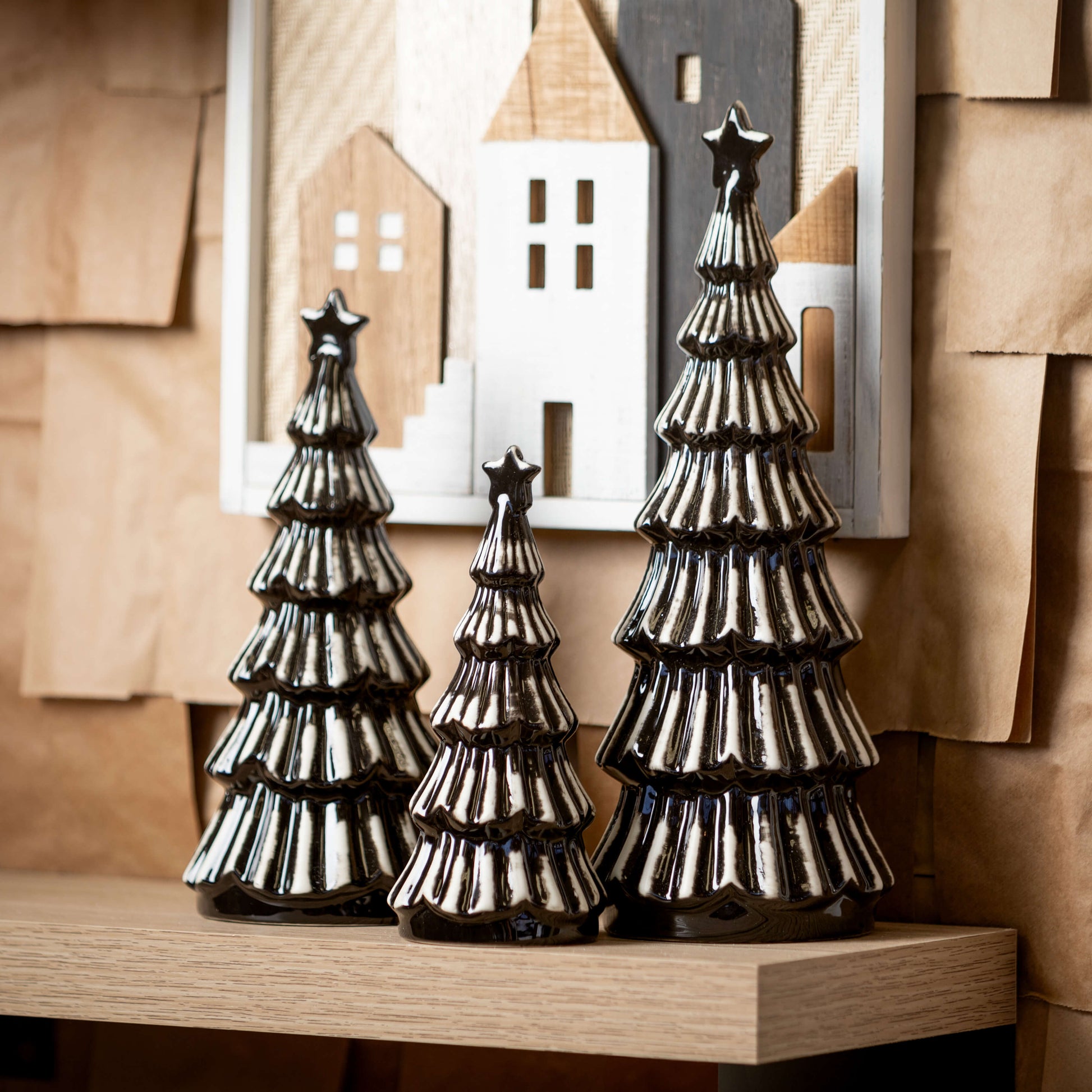 These three small modern black Christmas trees make a welcoming addition to your holiday decor, all without taking up too much space. In graduated sizes, they provide a cozy dose of Yuletide cheer without dominating the room. Perfect for those who enjoy a minimalist Christmas aesthetic, their simple black coloring and diminutive size give them an understated elegance that will stand the test of time.