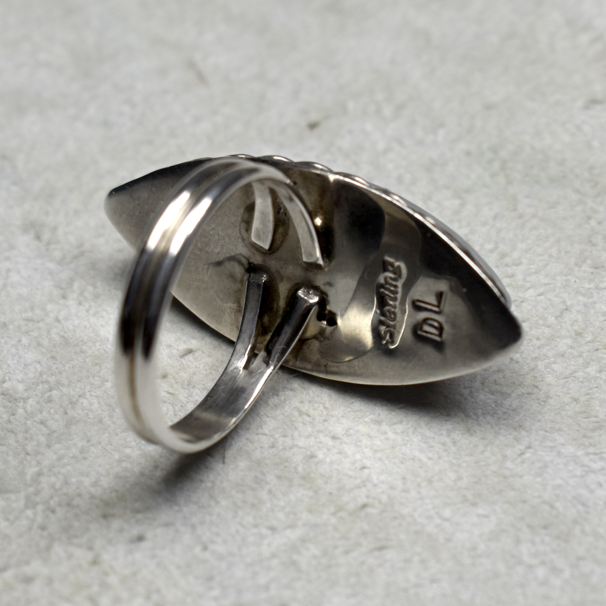 Handcrafted by Dawn Lucas, this sterling silver ring features a vibrant marquise shaped mother of pearl stone set in a classic rope border bezel. In the center, a striking bright blue daisy of Sleeping Beauty Turquoise completes this unique piece, making it a thoughtful and unique addition to any jewelry collection.