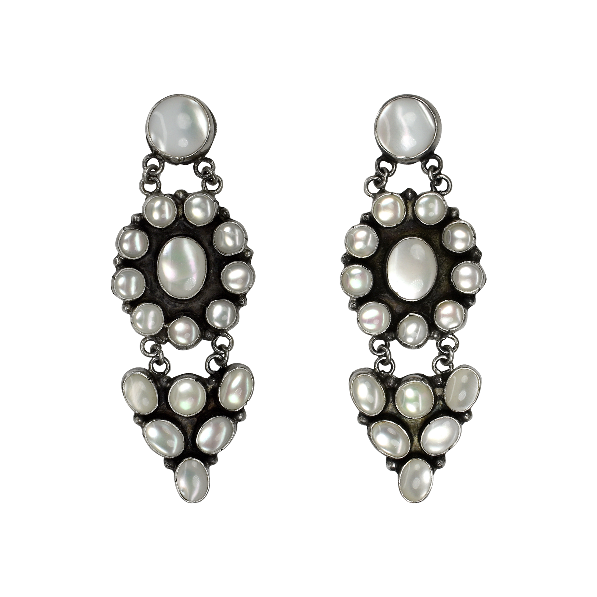 These gorgeous articulated Mother of Pearl earrings feature circular top studs with dangling triangular and flower-shaped elements below. The luminous shell adds a soft, iridescent glow that contrasts beautifully with the bold sterling silver design. With eye-catching movement and a playful sense of balance, these earrings are a true statement piece.