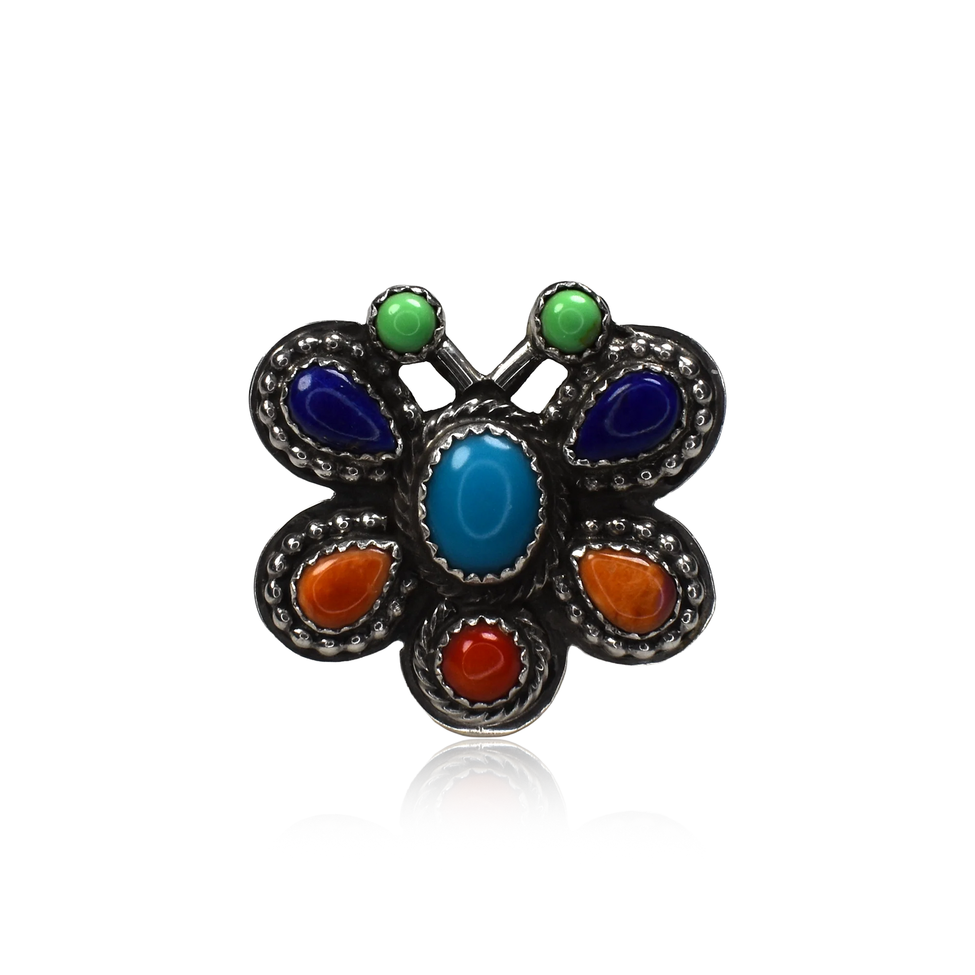 This hand-crafted Multi-Stone Hand-Tooled Butterfly Ring by Garrison Boyd features a playful and fun butterfly shape with vibrant coral, spiny oyster, lapis, gaspeite, and Sleeping Beauty turquoise stones. The exquisite craftsmanship is evident in the beaded sterling silver setting and three-pronged solid band. Let your personality shine with this statement piece.