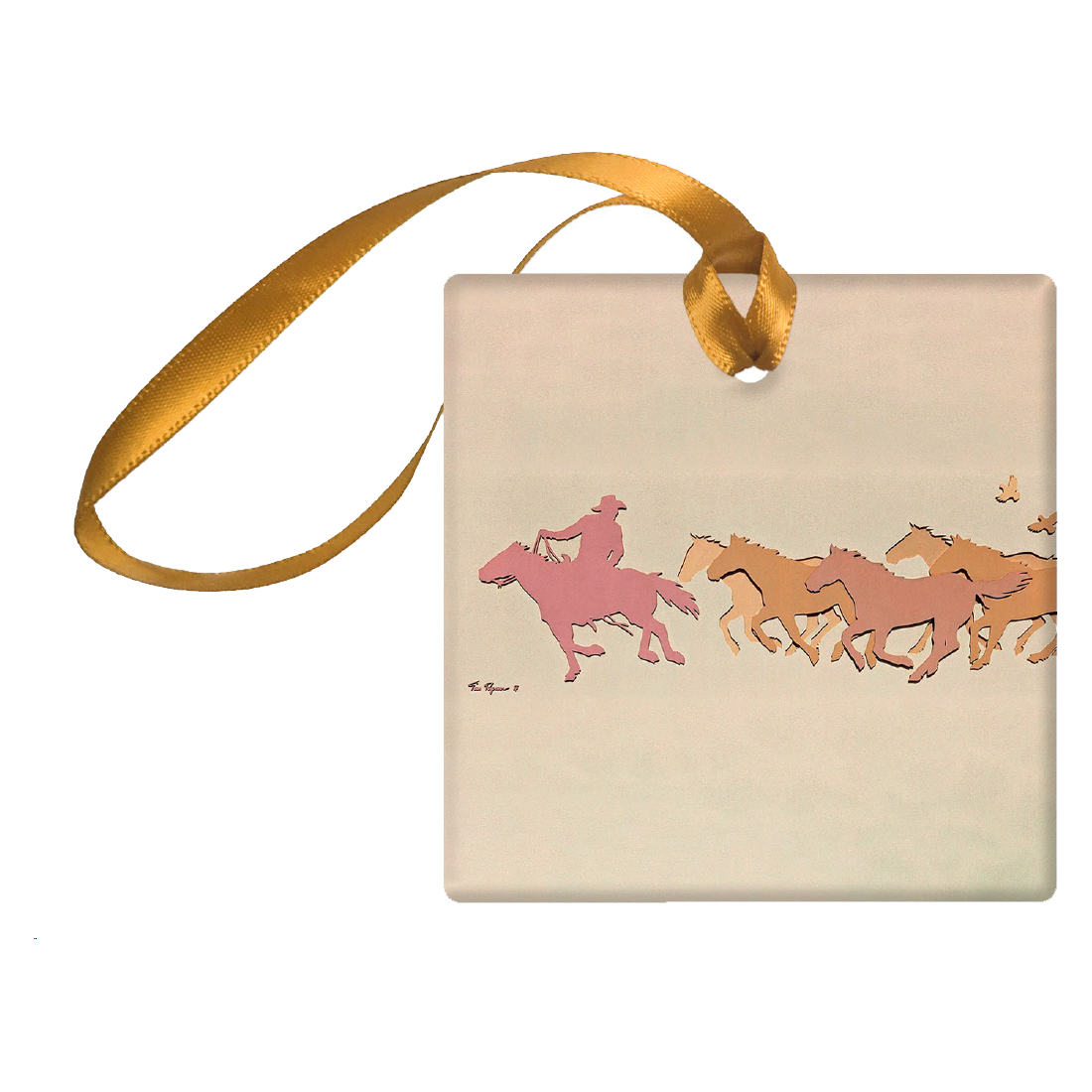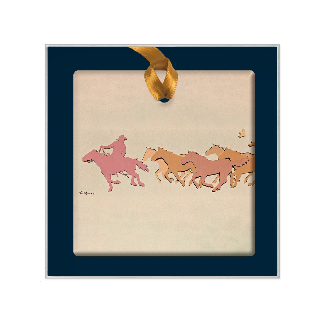 Celebrate the magic of Christmas with our exquisite 3" square porcelain ornament, featuring the stunning artwork "The Remuda" by renowned artist Tom Ryan. This collectible ornament captures the essence of the holiday season, making it a perfect addition to your festive decor or a thoughtful gift for loved ones. Elegantly designed, it comes complete with a luxurious gold satin cord for easy hanging on your tree or display.