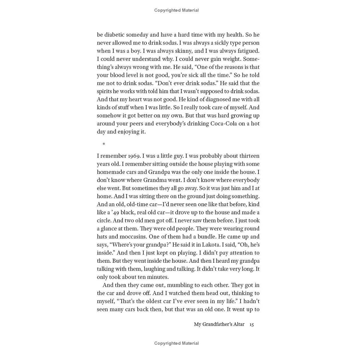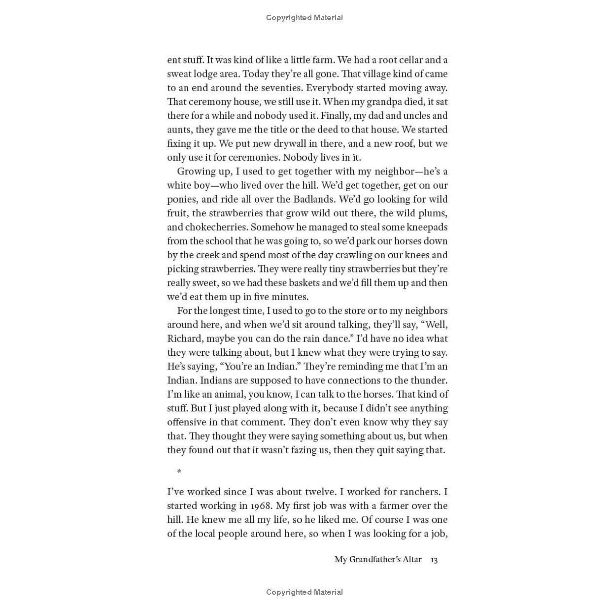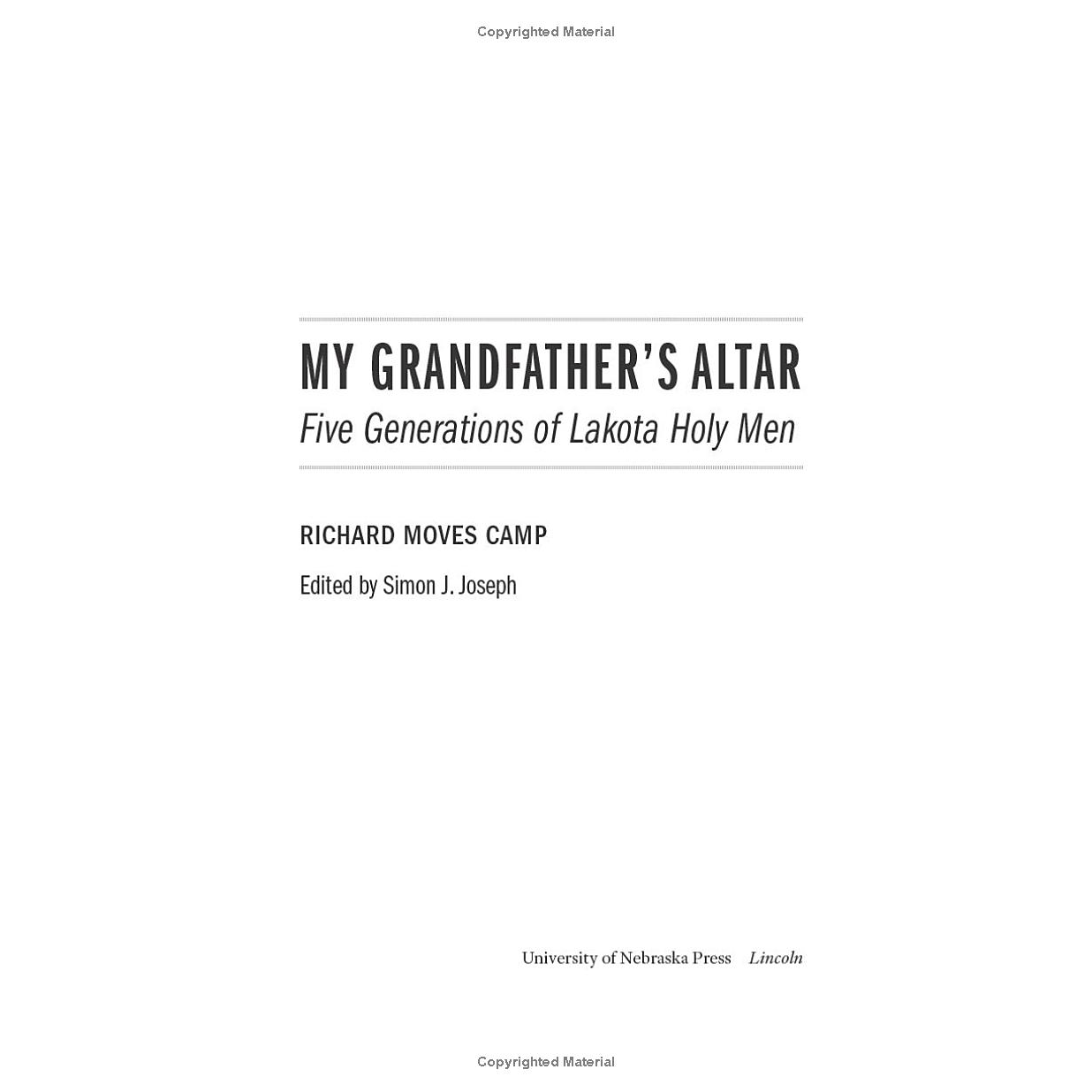 Richard Moves Camp’s My Grandfather’s Altar is an oral-literary narrative account of five generations of Lakota religious tradition. Moves Camp is the great-great-grandson of Wóptuȟ’a (“Chips”), the holy man remembered for providing Crazy Horse with war medicines of power and protection. The Lakota remember the descendants of Wóptuȟ’a for their roles in preserving Lakota ceremonial traditions during the official prohibition period (1883–1934), when the U.S. Indian Religious Crimes Code outlawed Indian religious ceremonies with the threat of imprisonment.