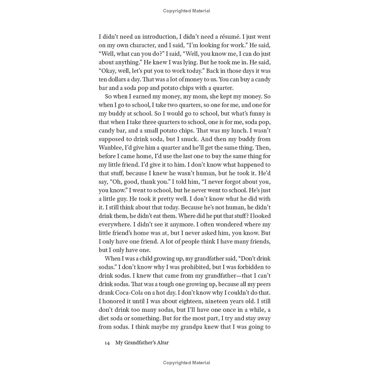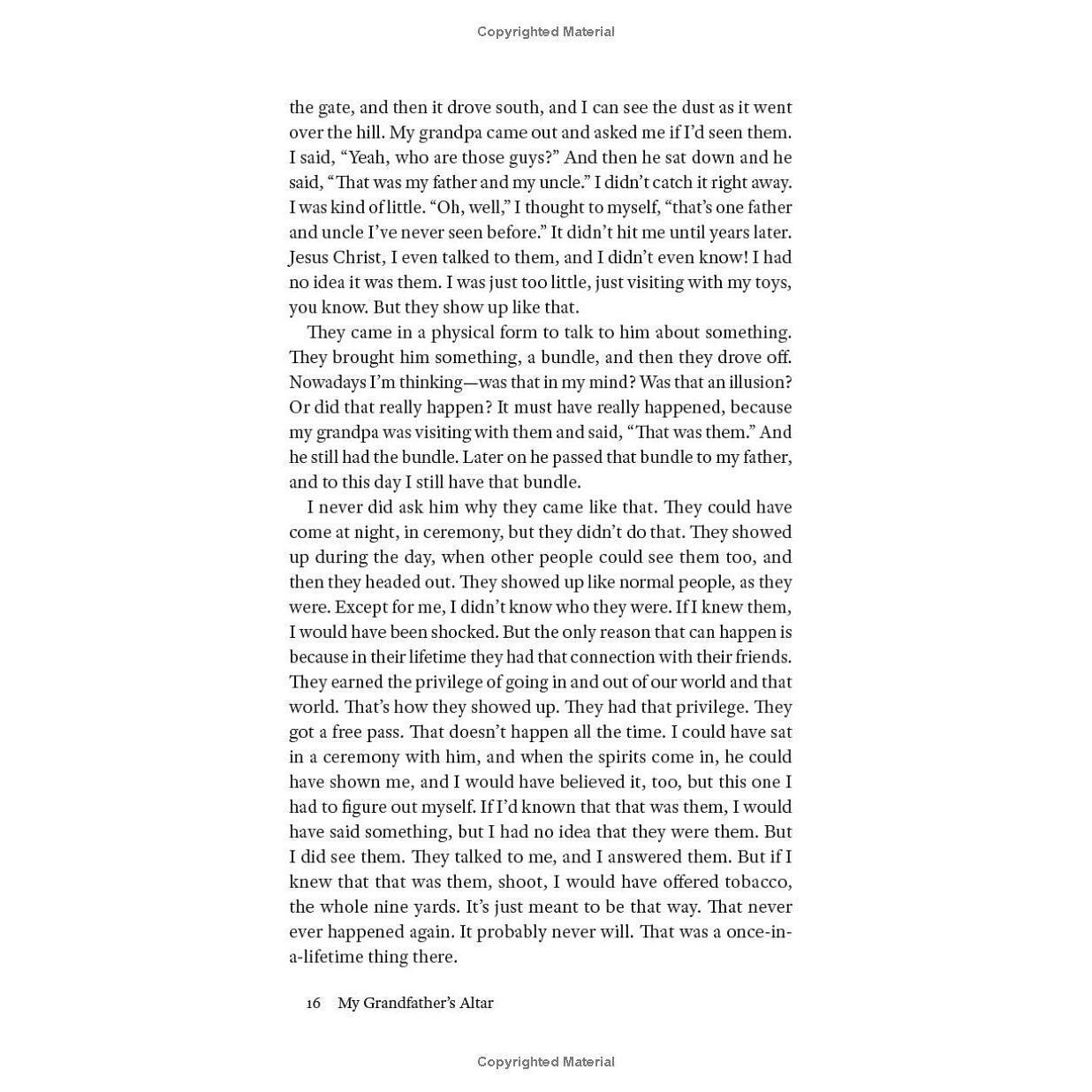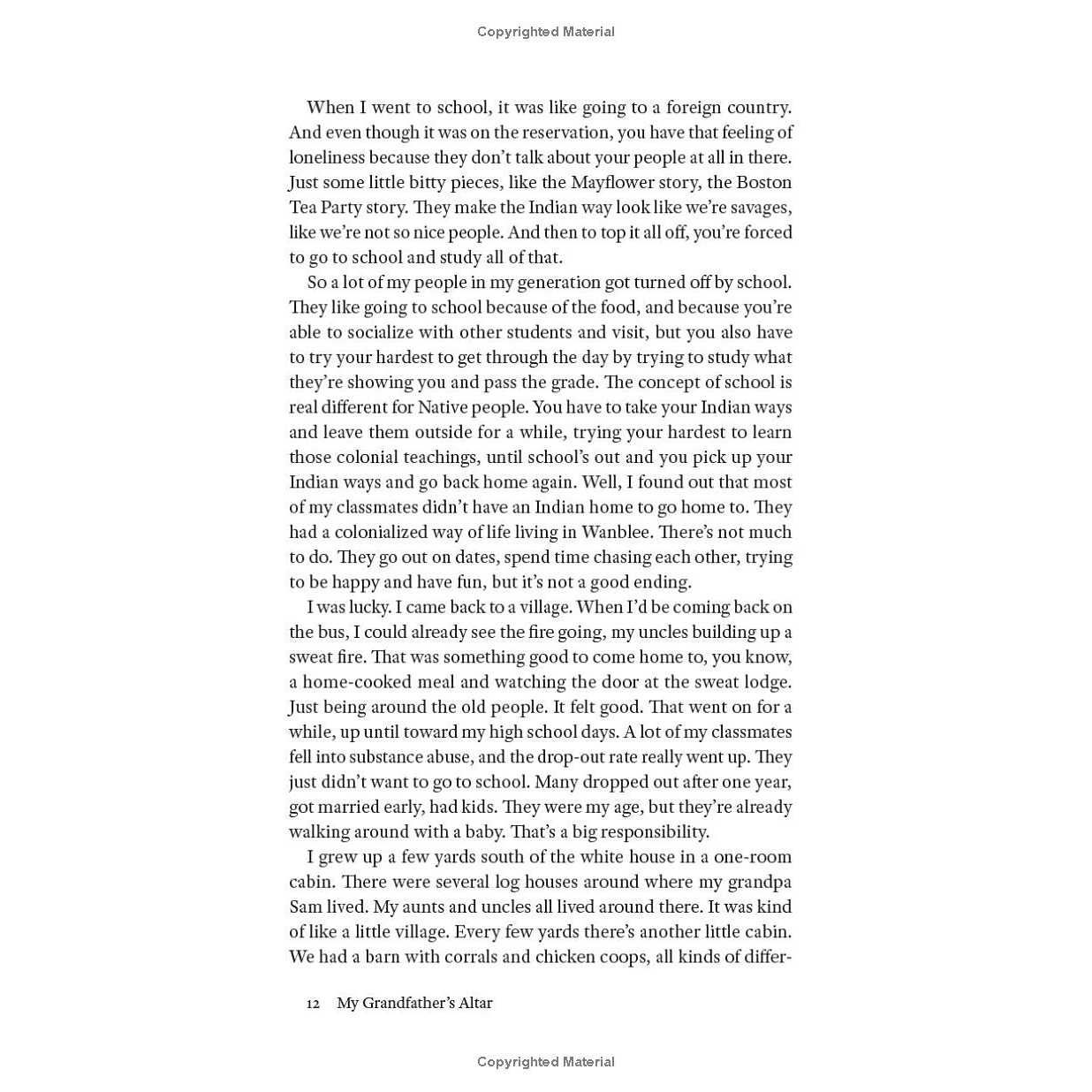 Richard Moves Camp’s My Grandfather’s Altar is an oral-literary narrative account of five generations of Lakota religious tradition. Moves Camp is the great-great-grandson of Wóptuȟ’a (“Chips”), the holy man remembered for providing Crazy Horse with war medicines of power and protection. The Lakota remember the descendants of Wóptuȟ’a for their roles in preserving Lakota ceremonial traditions during the official prohibition period (1883–1934), when the U.S. Indian Religious Crimes Code outlawed Indian religious ceremonies with the threat of imprisonment.