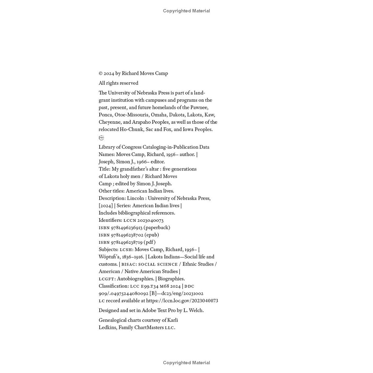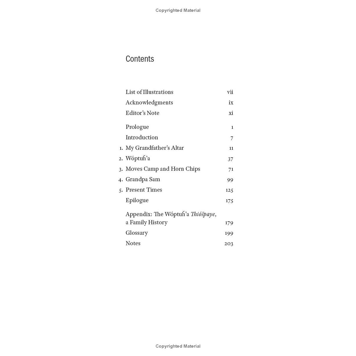 Wóptuȟ’a, his two sons, James Moves Camp and Charles Horn Chips, his grandson Sam Moves Camp, and his great-great-grandson Richard Moves Camp all became well-respected Lakota spiritual leaders. My Grandfather’s Altar offers the rare opportunity to learn firsthand how one family’s descendants played a pivotal role in revitalizing Lakota religion in the twentieth century.