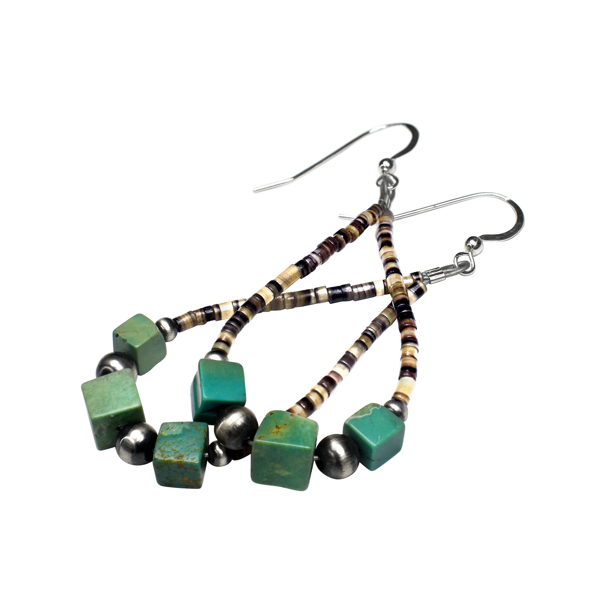 These Natural Green Turquoise Cube & Heishi Teardrop Earrings blend classic Southwestern materials with a graceful, contemporary silhouette. Three softly faceted cubes of natural green turquoise—each showing its own unique matrix—sit at the base of a flexible teardrop made from traditional heishi beads. Smooth sterling silver accent beads add a bright contrast, bringing balance and polish to the organic textures.