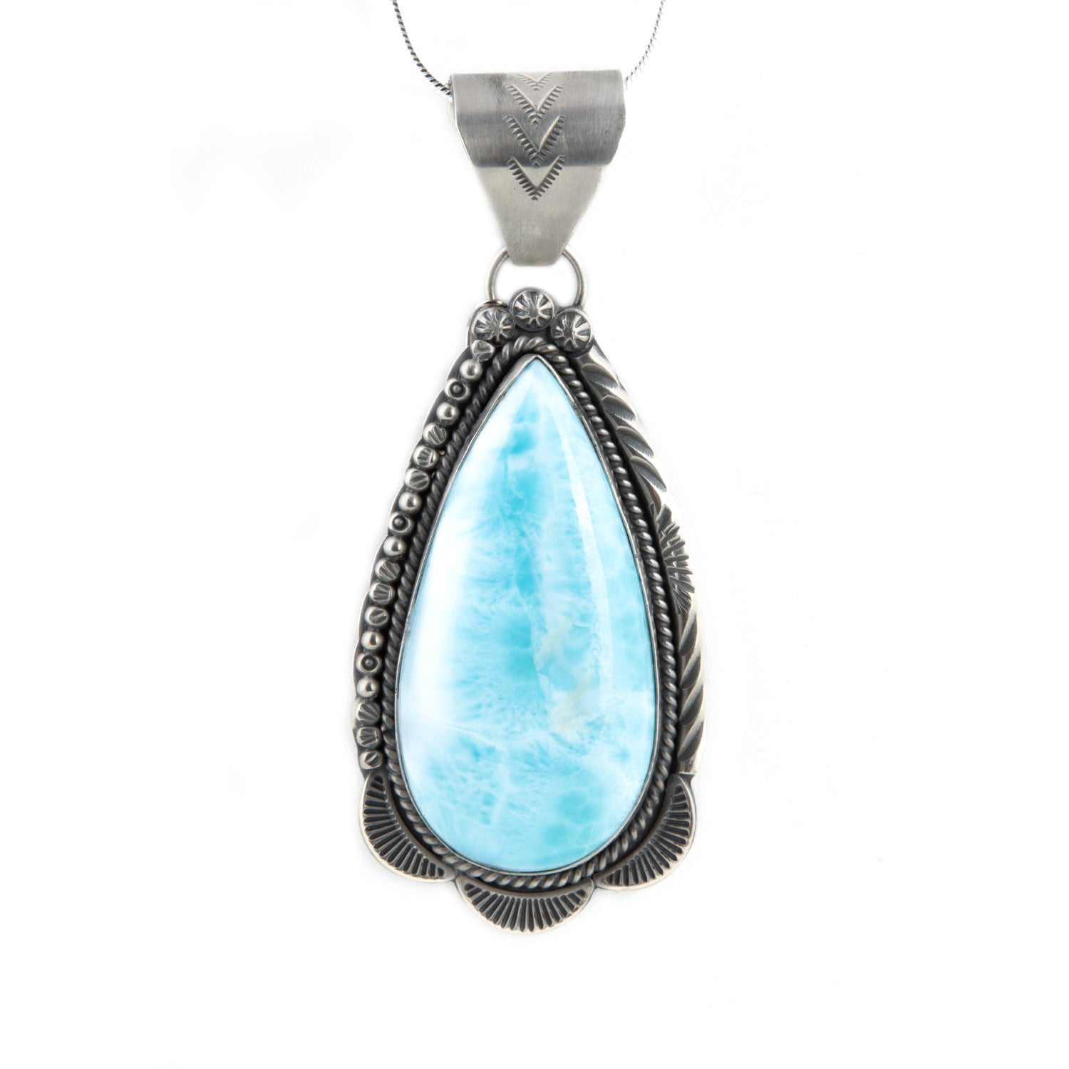Discover the serene beauty of the Caribbean with this striking larimar pendant, handcrafted by Navajo silversmith Gilbert Platero. Known for his masterful stone-setting and bold yet elegant designs, Platero elevates each piece into a wearable work of art.