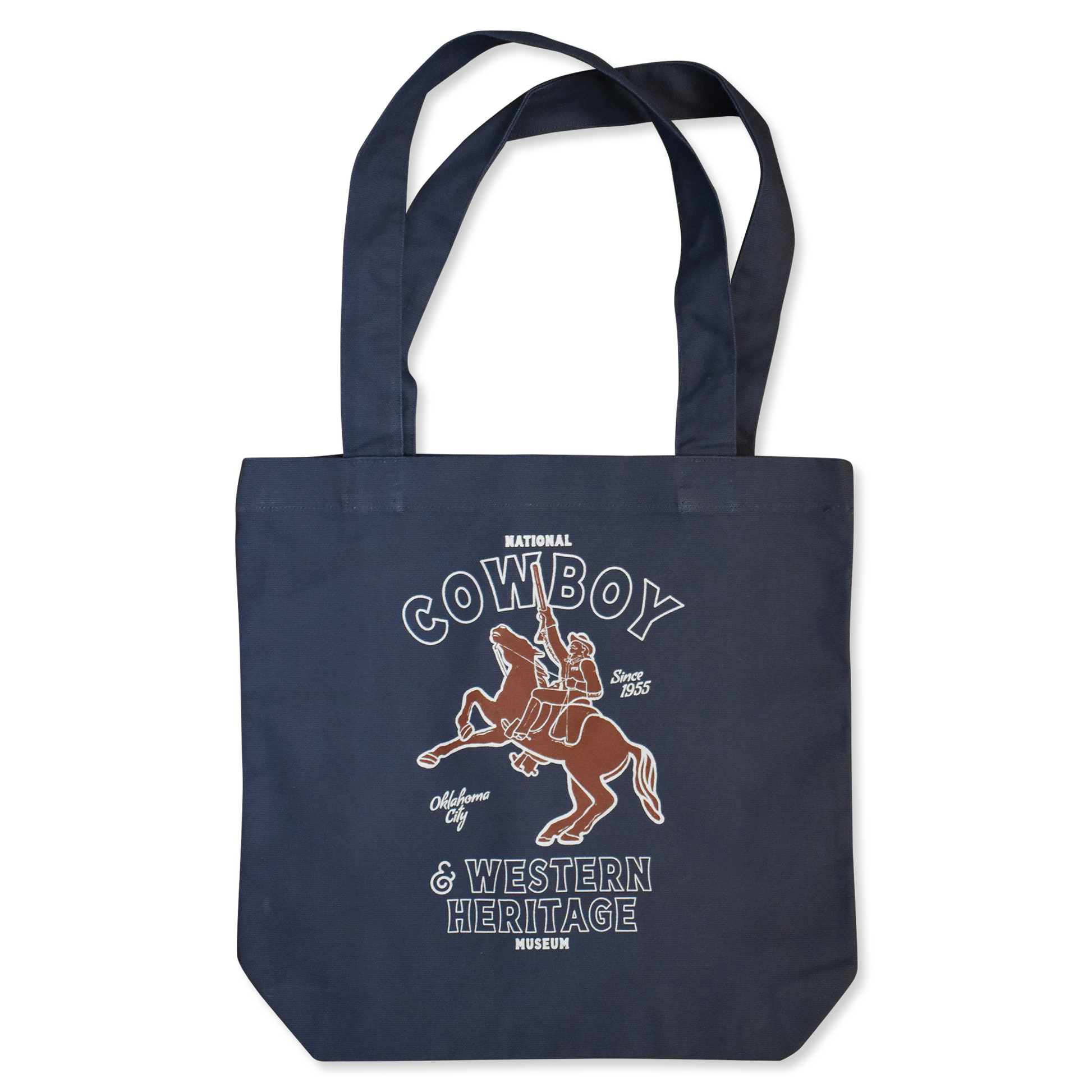 Carry a piece of Western history with you wherever you go with our NCM Buffalo Bill Canvas Tote Bag in Midnight Navy. This stylish and durable tote features artwork inspired by the striking statue of Buffalo Bill Cody that stands proudly on the grounds of the National Cowboy & Western Heritage Museum.