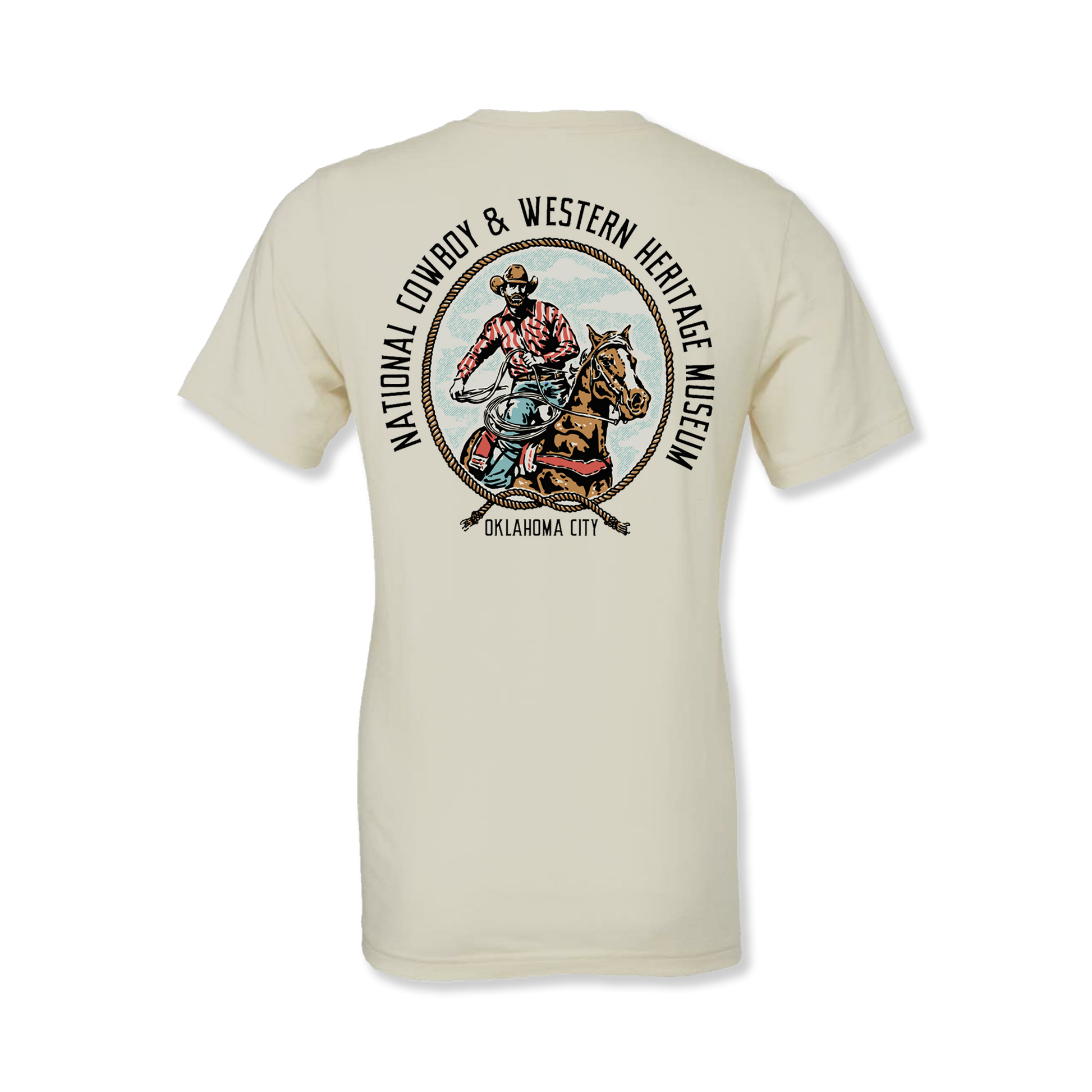 Crafted from premium-quality cotton for all-day comfort, this classic t-shirt features a bold, vintage-inspired design of a cowboy in action, lasso in hand, atop a galloping horse. The detailed back graphic is framed by a rope border, proudly showcasing the museum's name, while the front boasts a subtle chest emblem for a stylish yet rugged look.
