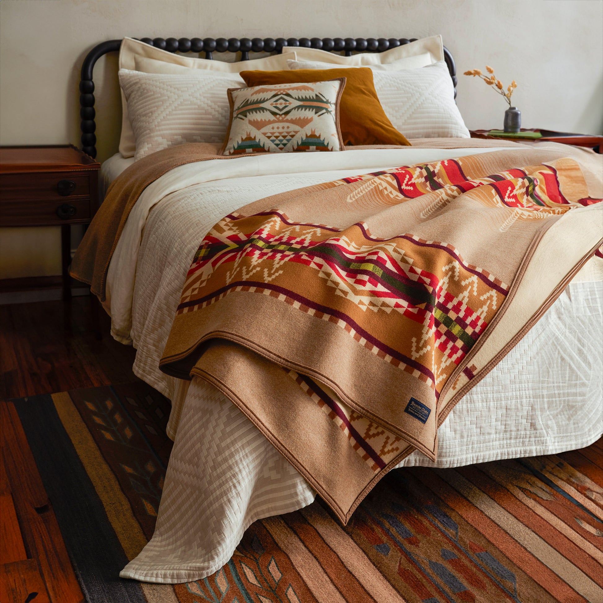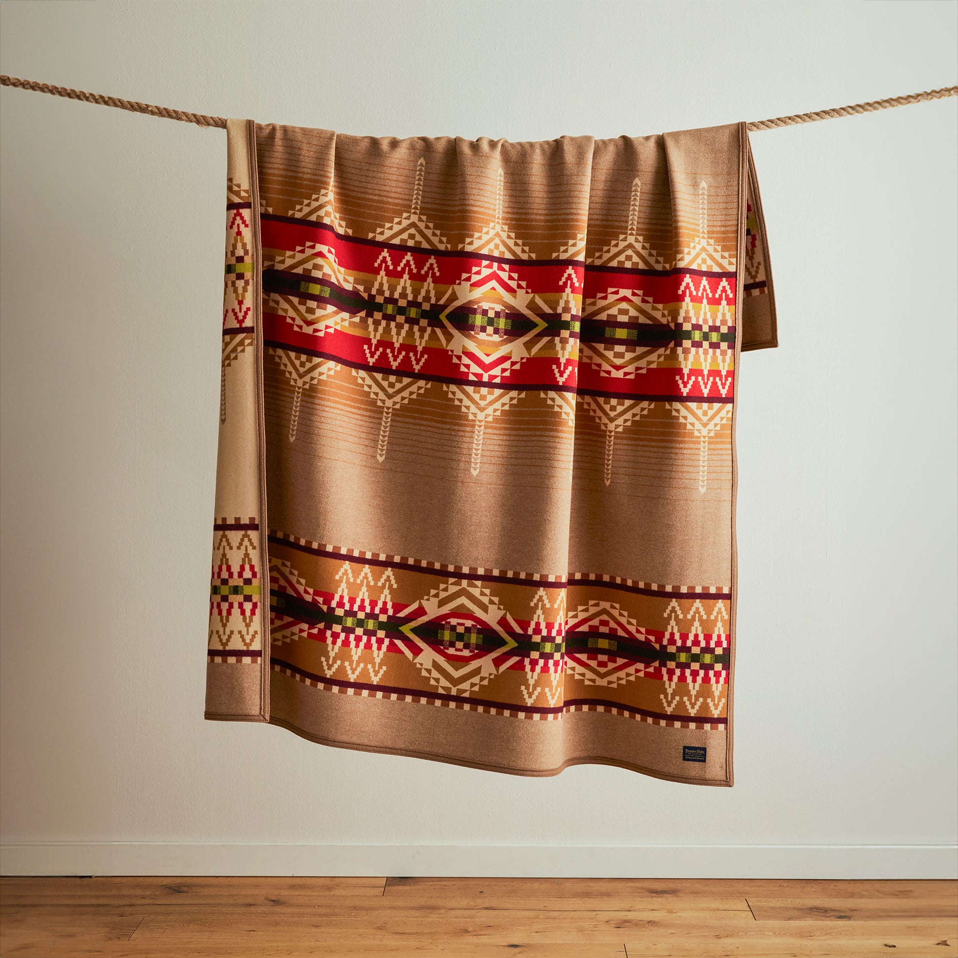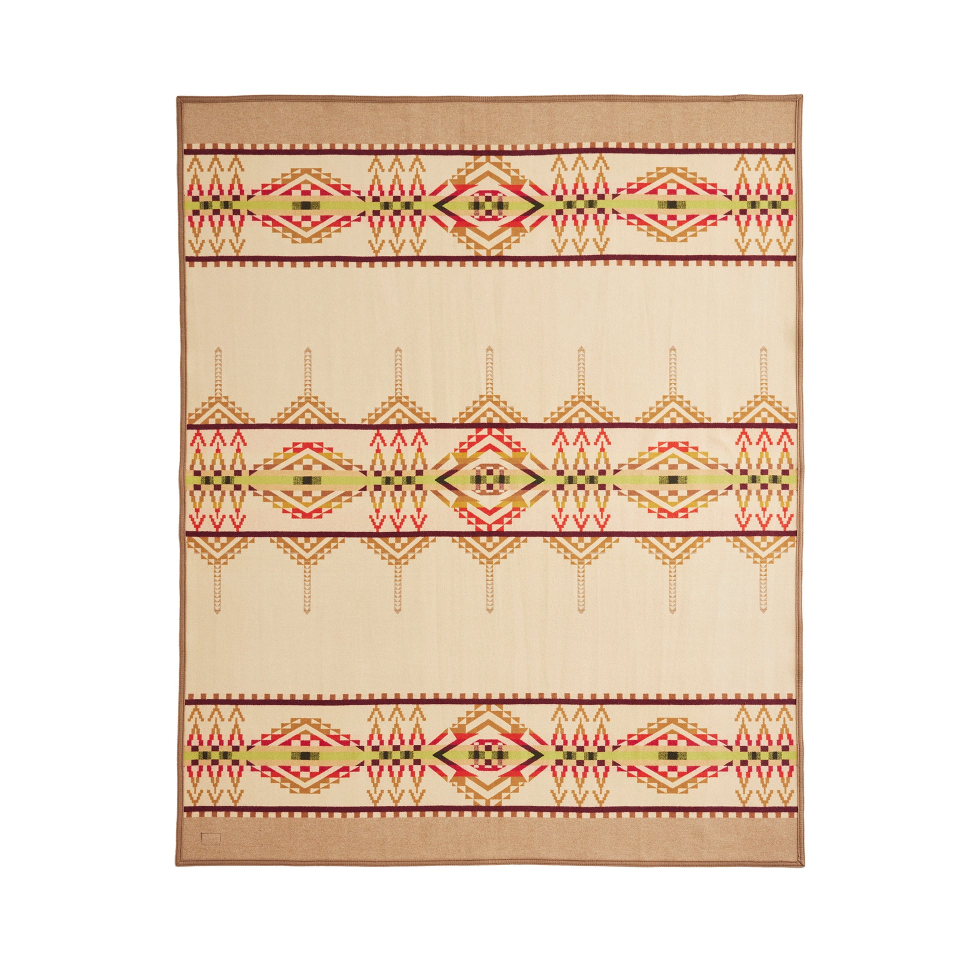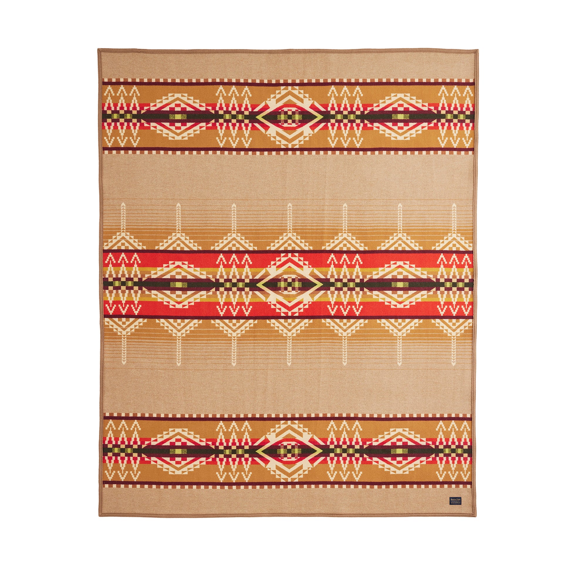 A luxurious wool jacquard blanket, made in USA from fabric woven in Pendleton's American mills. In this pattern, geometric pinnacles pay tribute to Beacon Rock, a dramatic formation in the Columbia River Gorge. Geometric hills and cliffs border a center band that represents the mighty Columbia on its path to the Pacific Ocean. Reverses for two distinct looks.