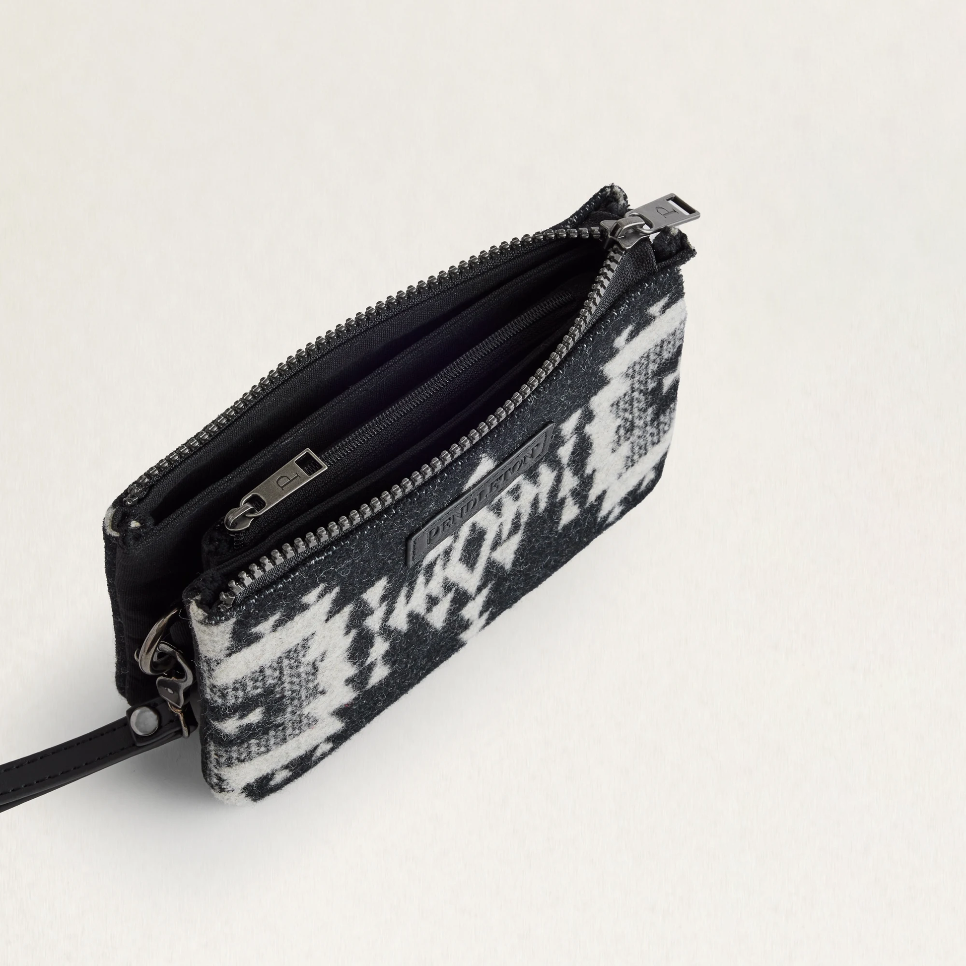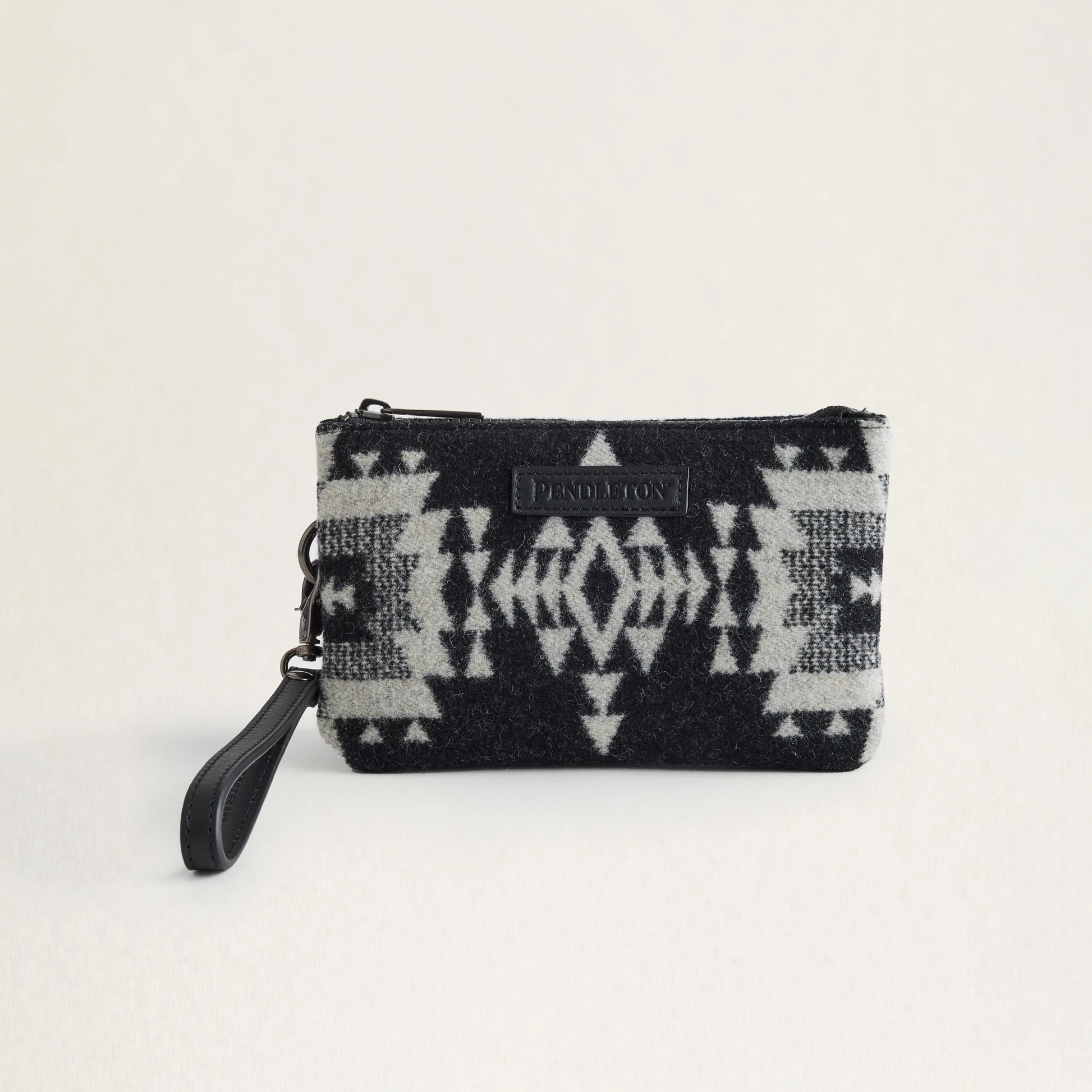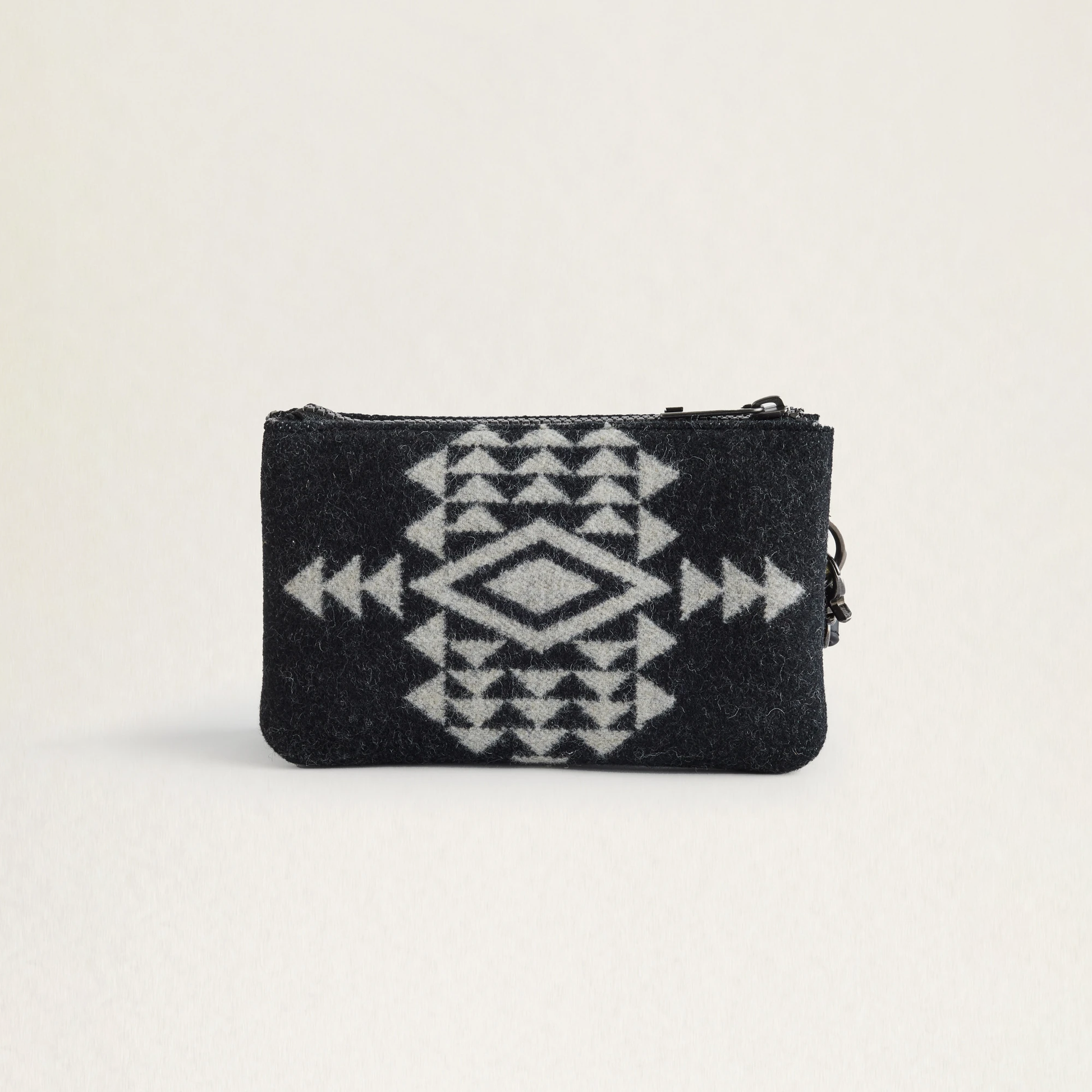 A trio of lined pockets hold cash, credit cards, cell phone, key, lip balm and other small essentials. Crafted from Pendleton's woven-in-USA wool jacquard fabric, with detachable canvas wristlet strap and top zipper. Pattern placement may vary from image shown.