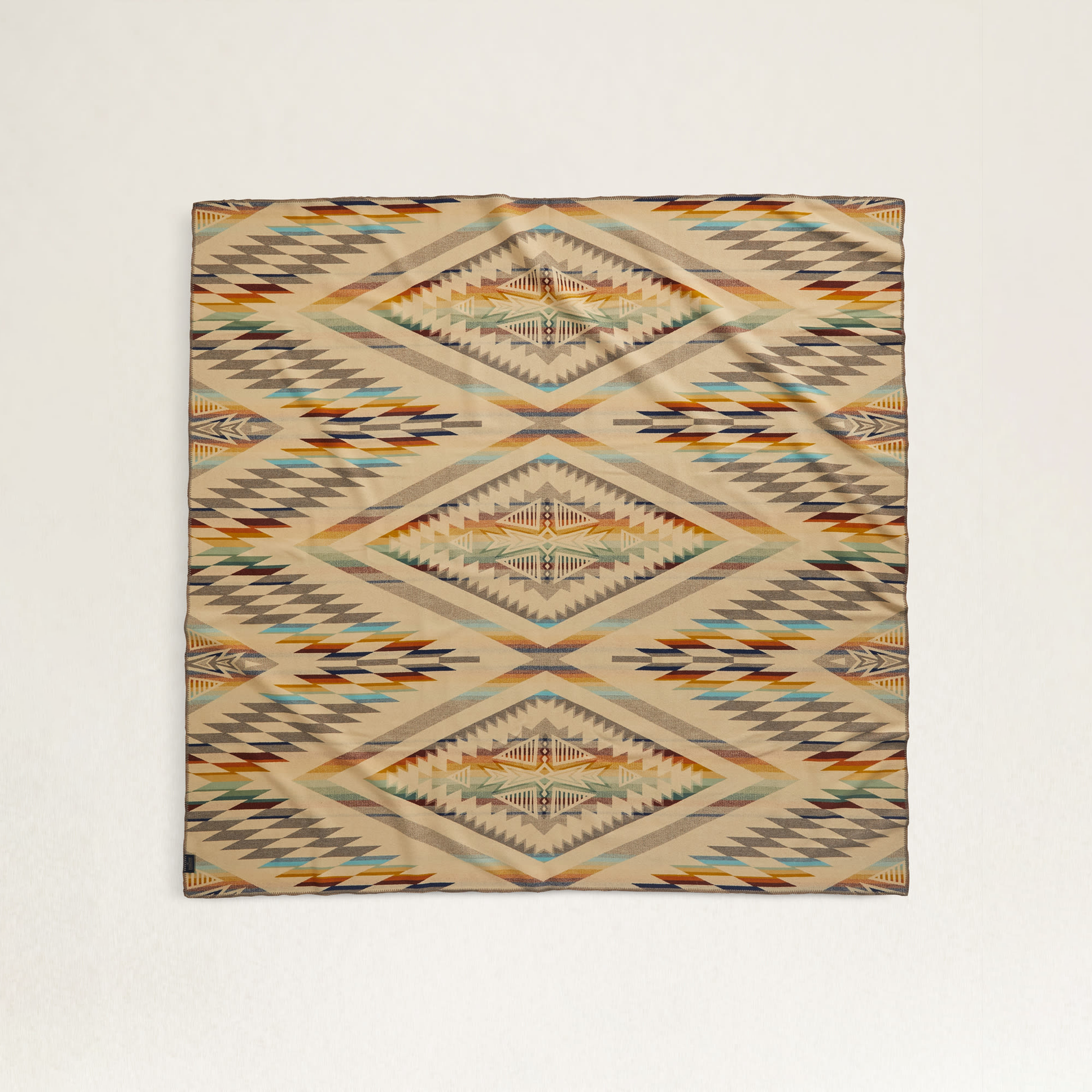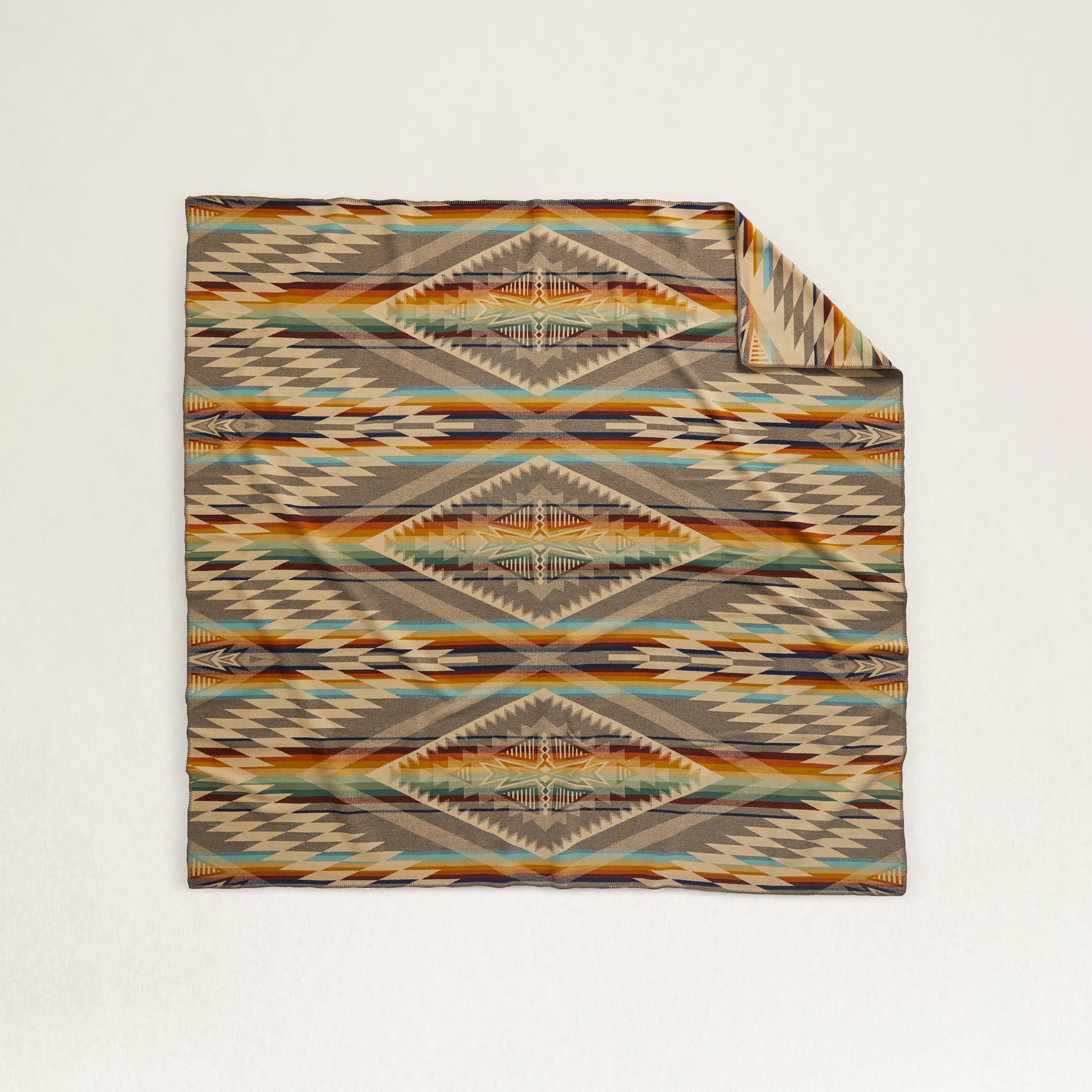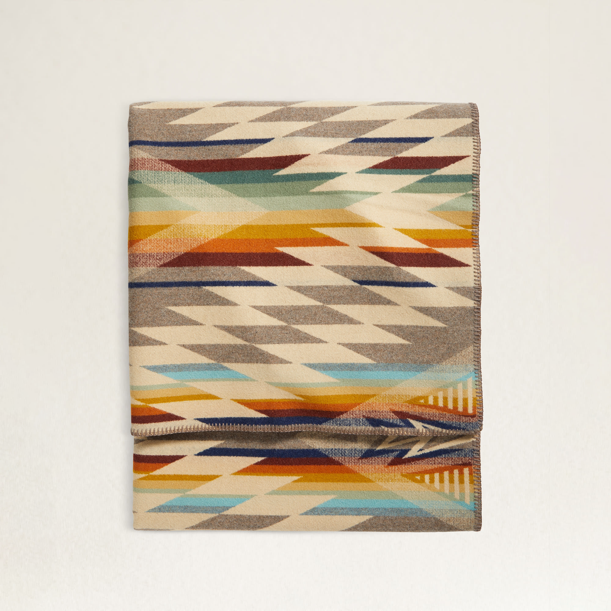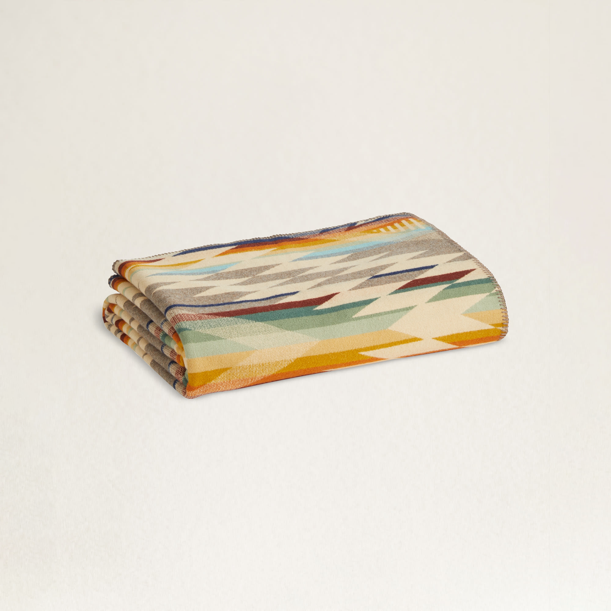 This colorful pattern was inspired by the Summerland Trail in Mt. Rainier National Park, voted Best Wildflower Spot in the USA by 1889 Magazine. Vibrant bands of color capture the wildflowers, waterfalls and mountain views within the park. Crafted from pure virgin wool/cotton, the reversible jacquard has two distinct looks.