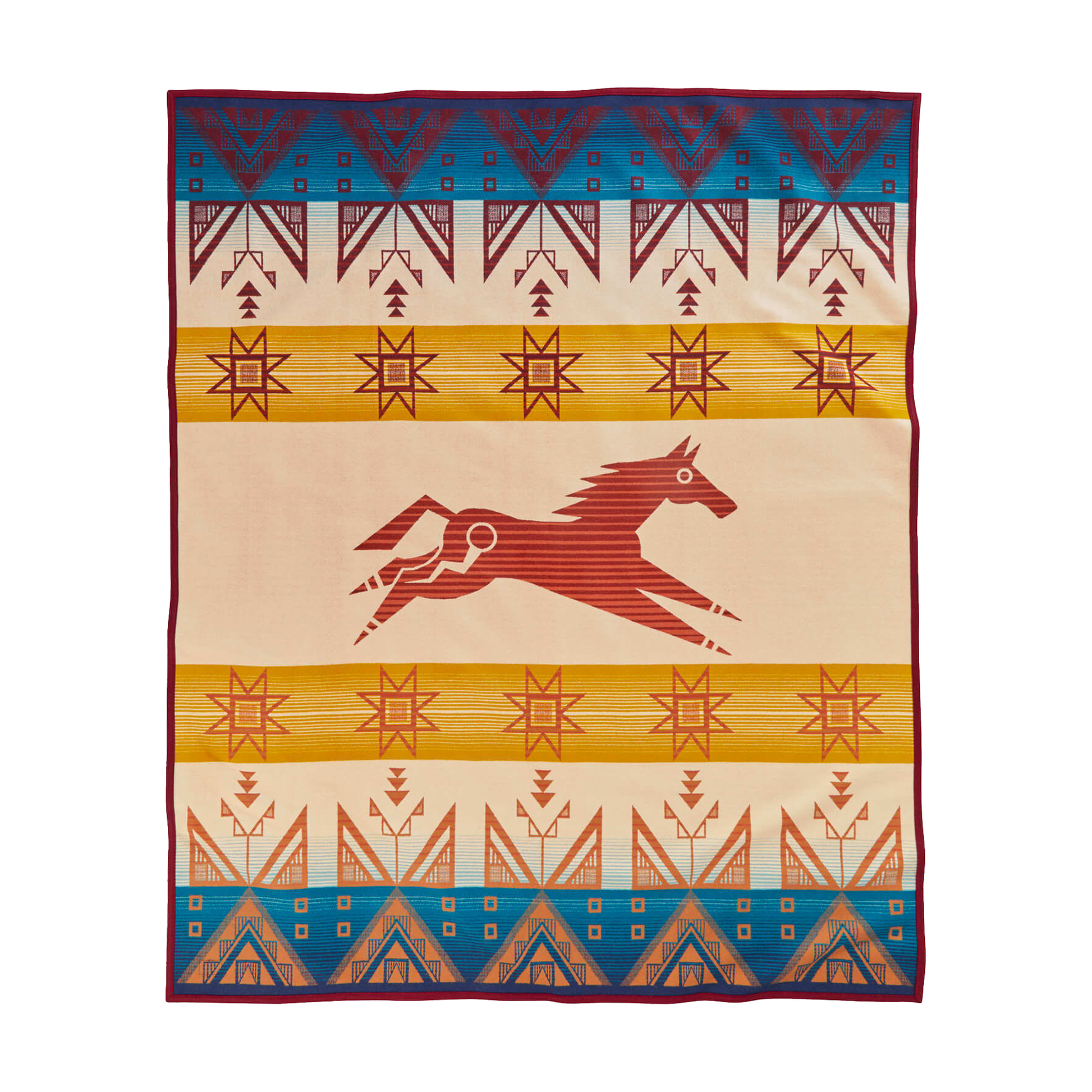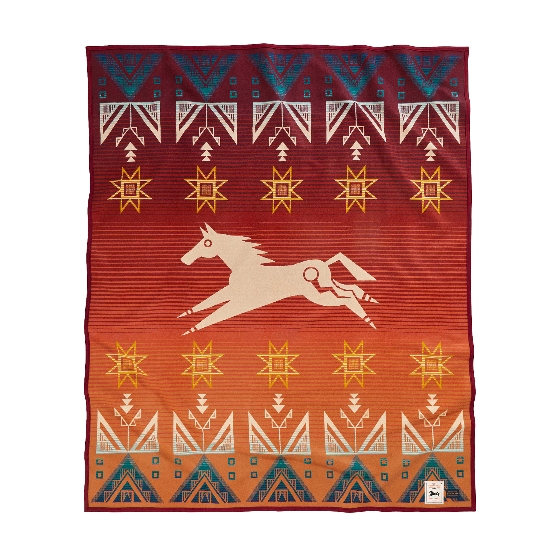 In this blanket pattern, a horse gallops through a Lakota village of traditional tepees at sunrise, while a geometric Morning Sun greets the dawn over each dwelling. The Lakota word for horse is Sunka Wakan or "Holy Dog," a symbol that stands for strength and unity. This wool blanket was designed by Native American artist by Chelysa Owens-Cyr, and is crafted from start to finish at Pendleton's Oregon mill for quality you can count on.