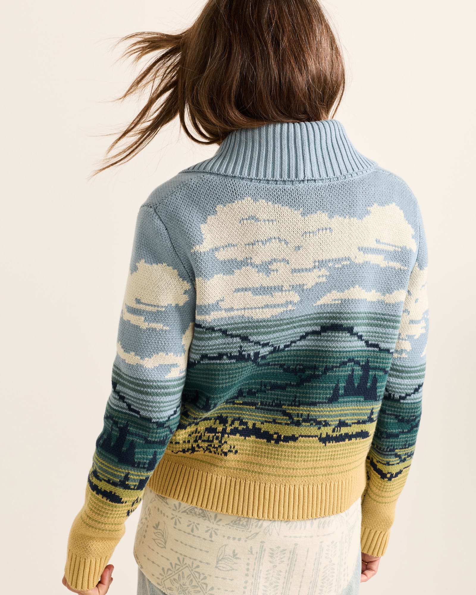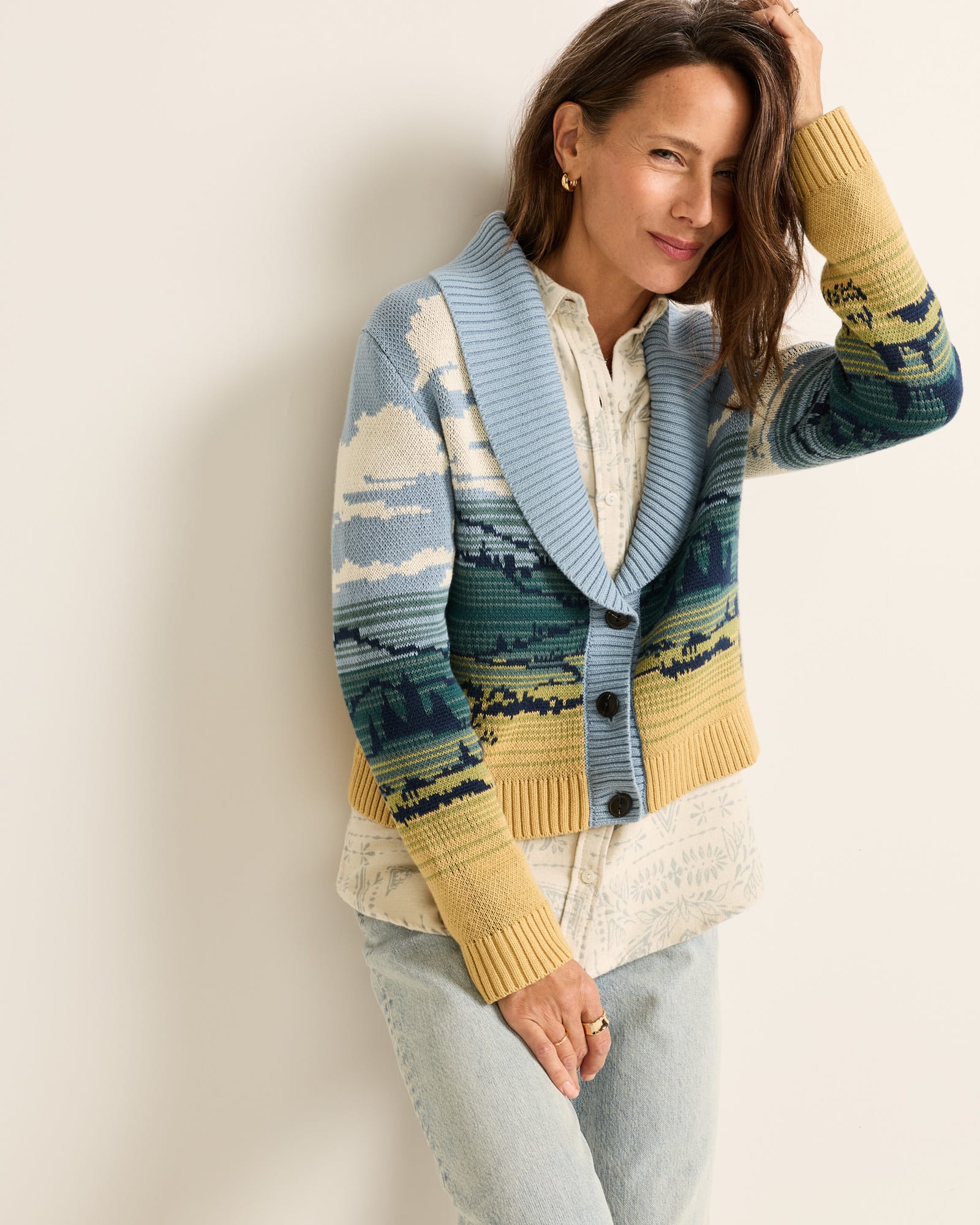 The Big Sky Cardigan brings Western artistry to everyday style with a striking allover scene knit across the body and sleeves. Crafted from cotton, this women's cardigan sweater features a ribbed shawl collar, placket, cuffs, and hem that frame the bold design with structure and comfort. The button-front silhouette makes it easy to wear open or closed, while its shorter length pairs perfectly with high-waisted denim, skirts, or dresses. A versatile cotton cardigan that captures the spirit of the American West while offering breathable comfort for year-round wear.