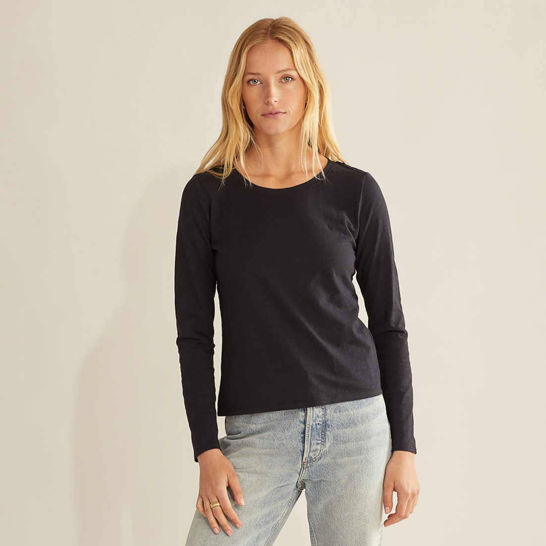 A Black layering essential in a soft, mid-weight cotton knit with a slubbed texture. Relaxed fit with rounded neckline.