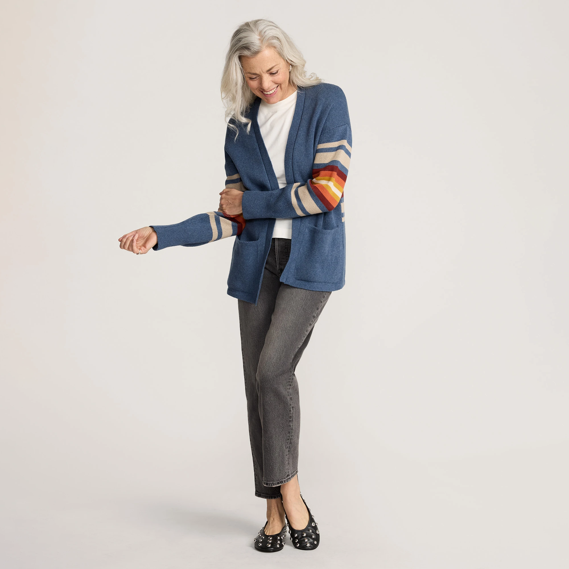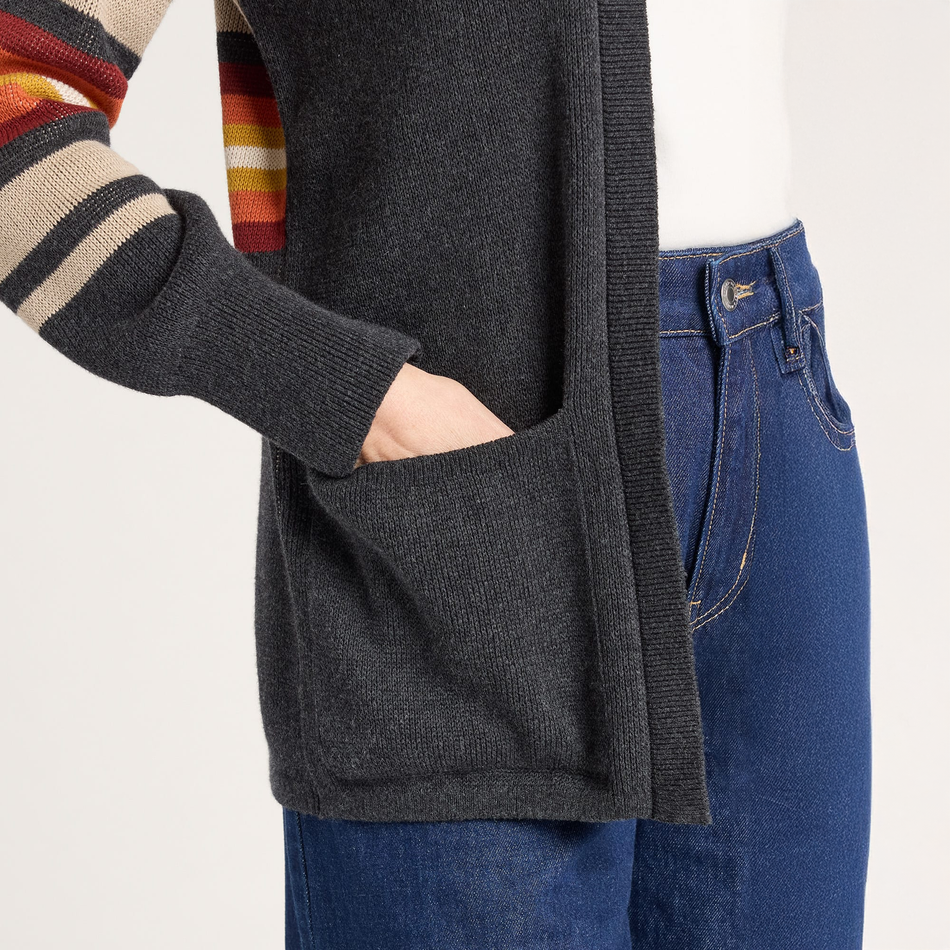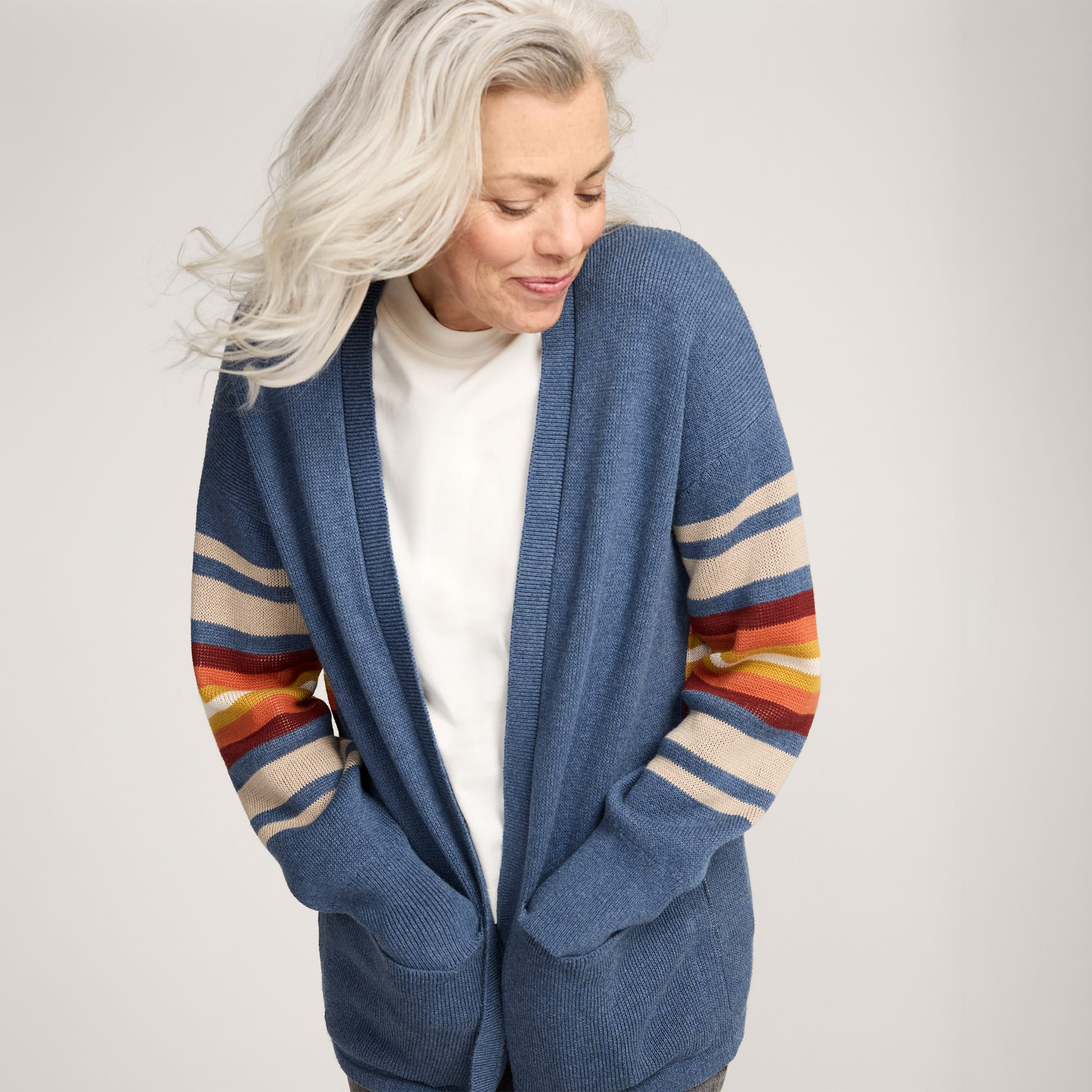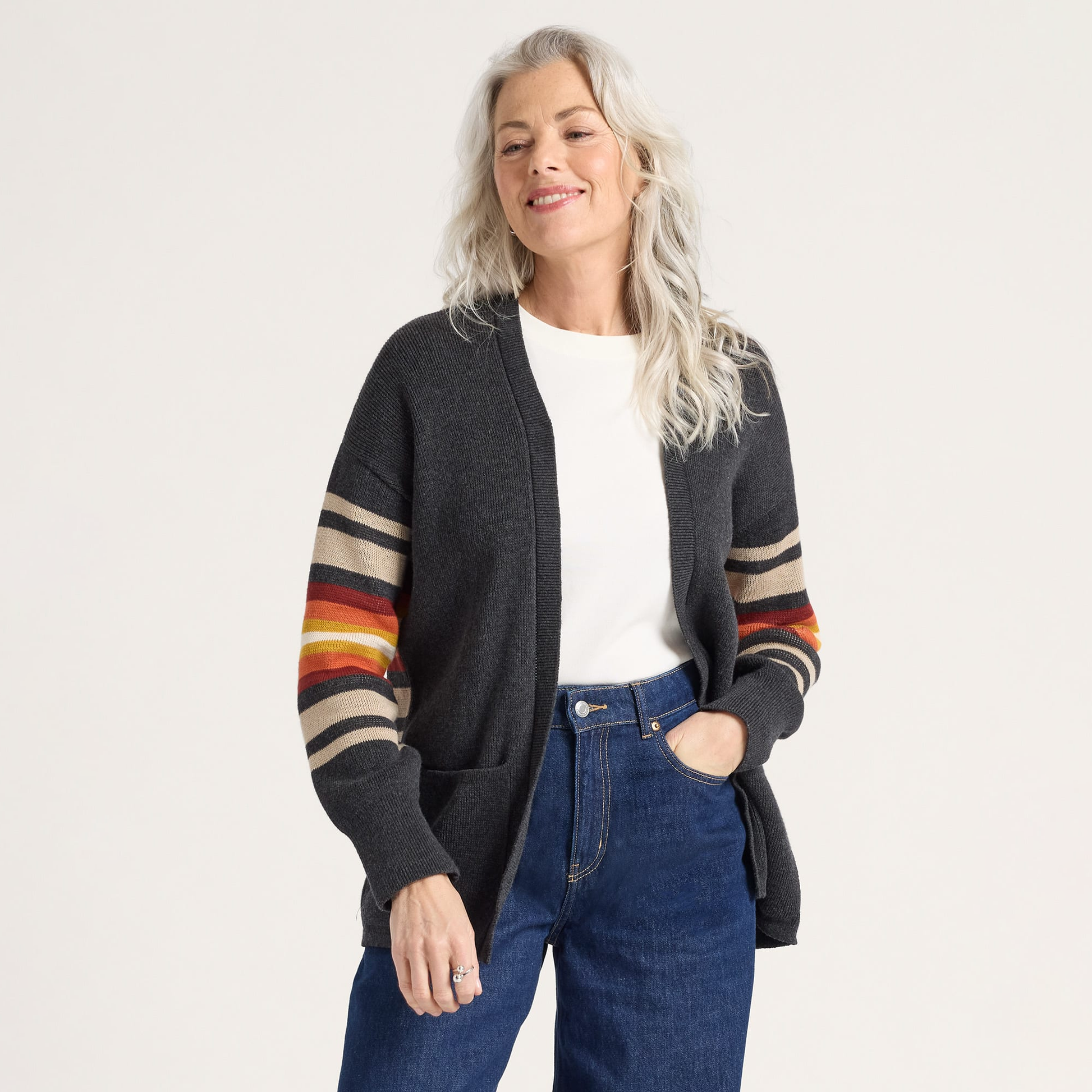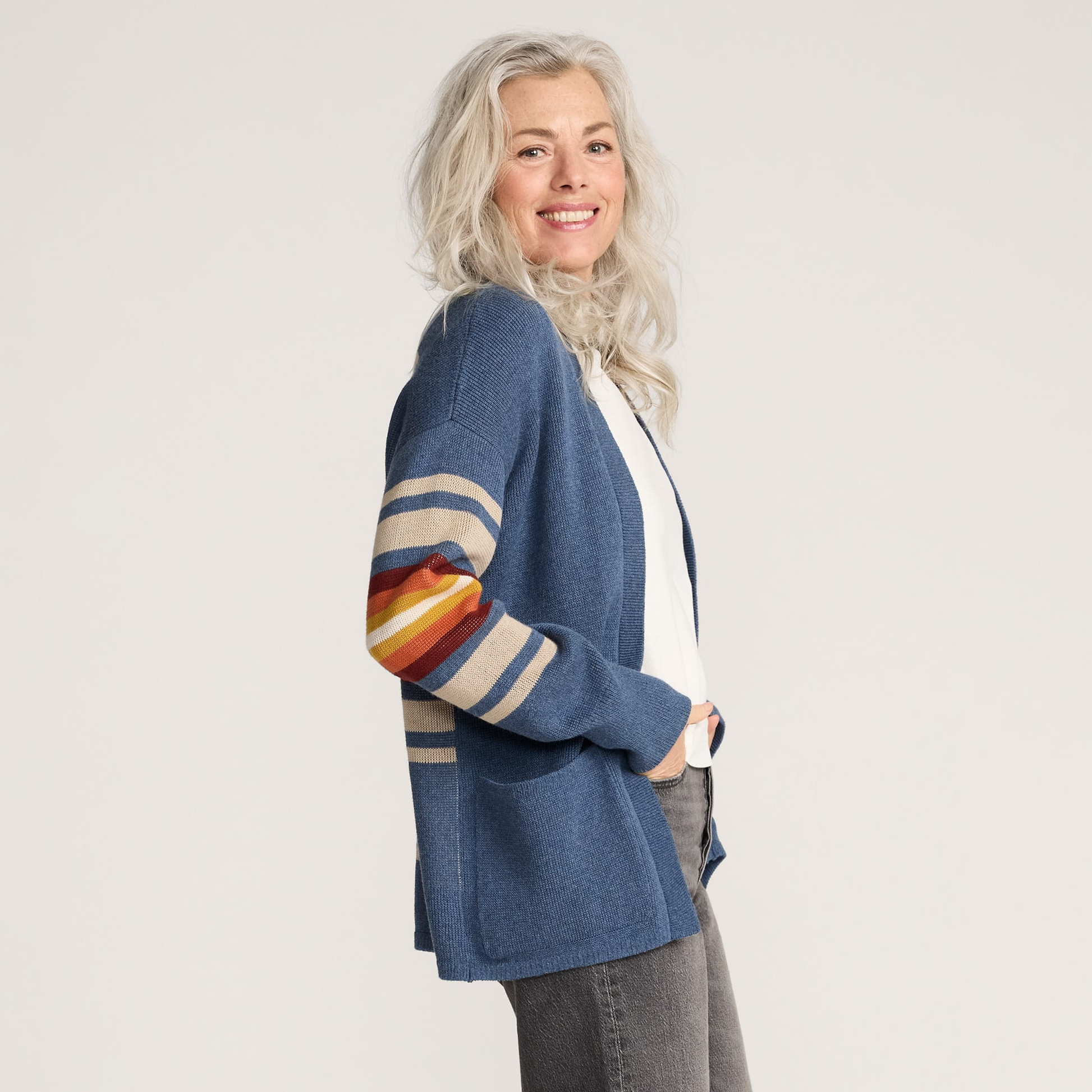 A cozy open-front cardigan in a tonal jacquard pattern inspired by natural springs. Knit from soft cotton yarn with ribbed edges, two patch pockets and relaxed styling. Perfect for layering in every season.