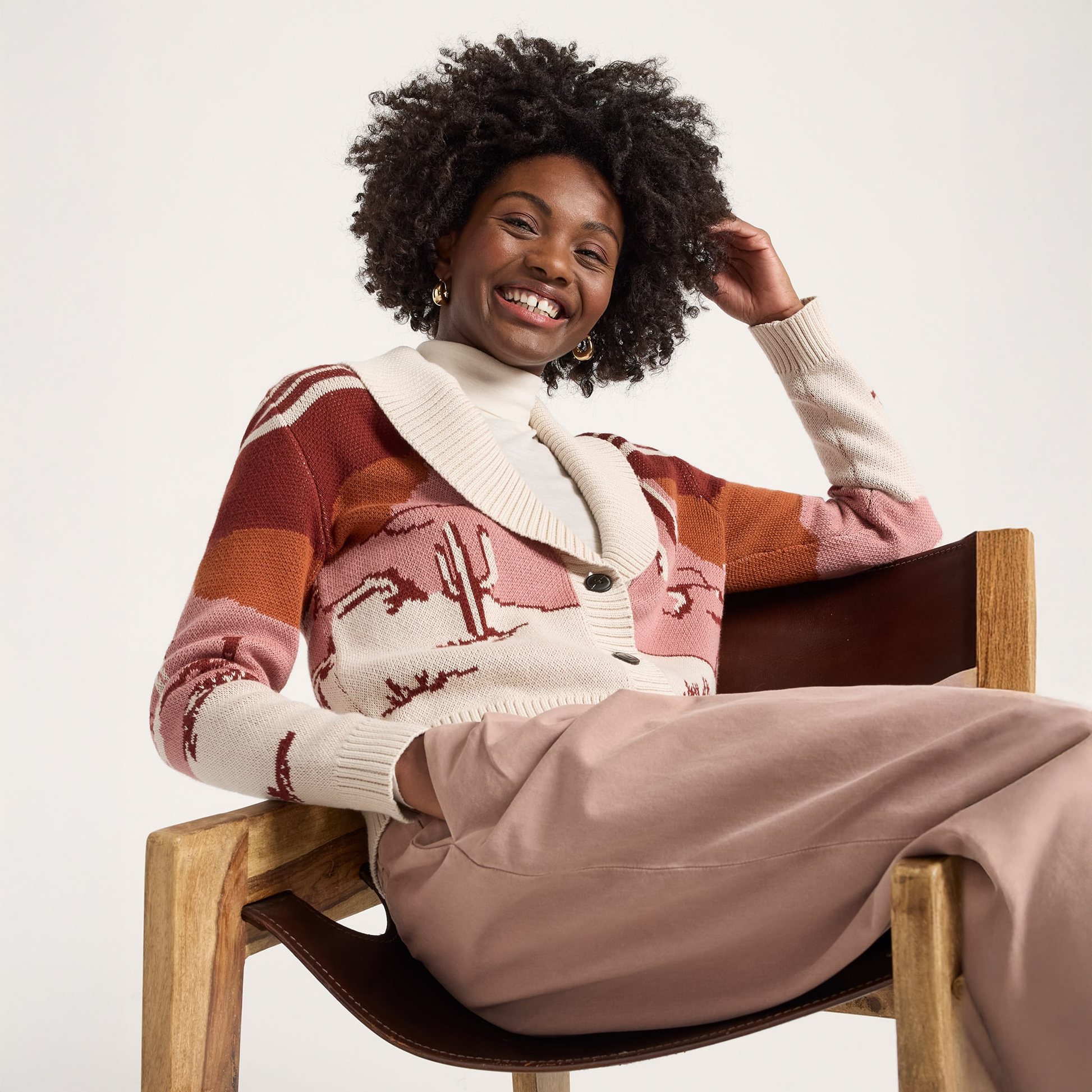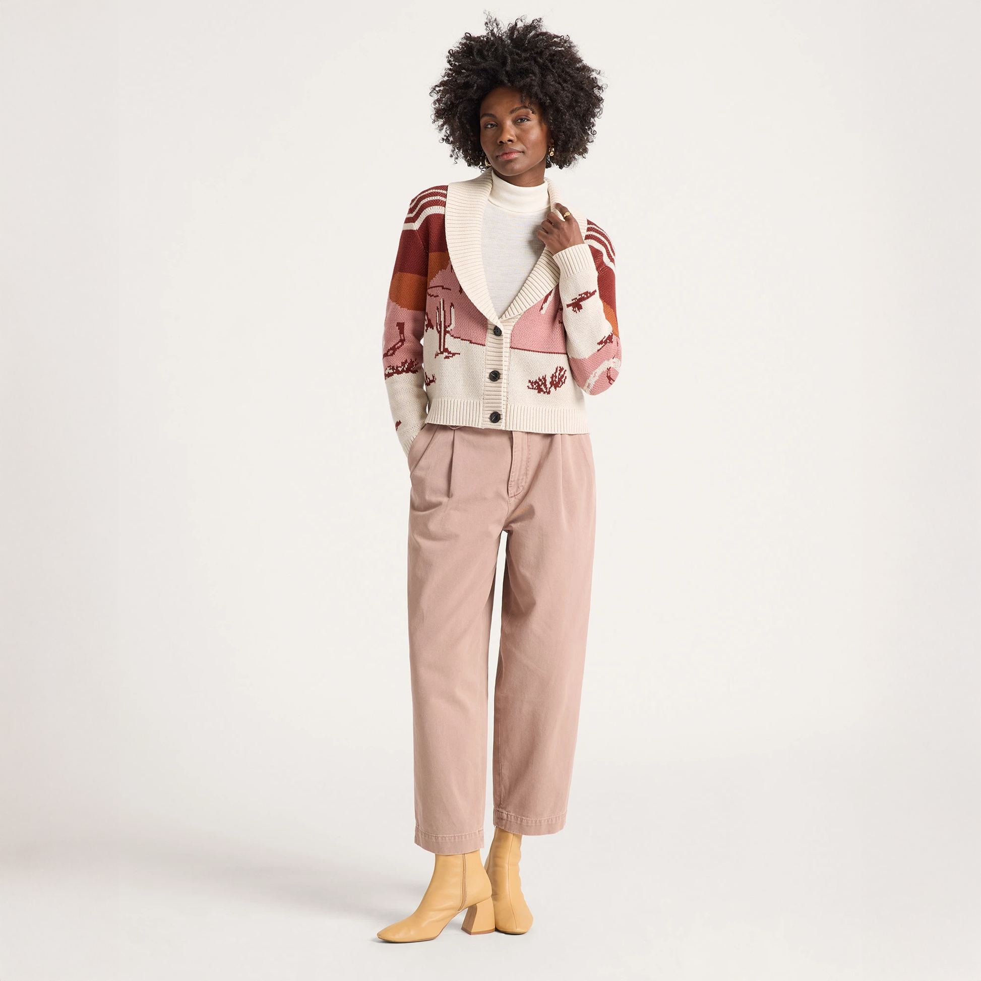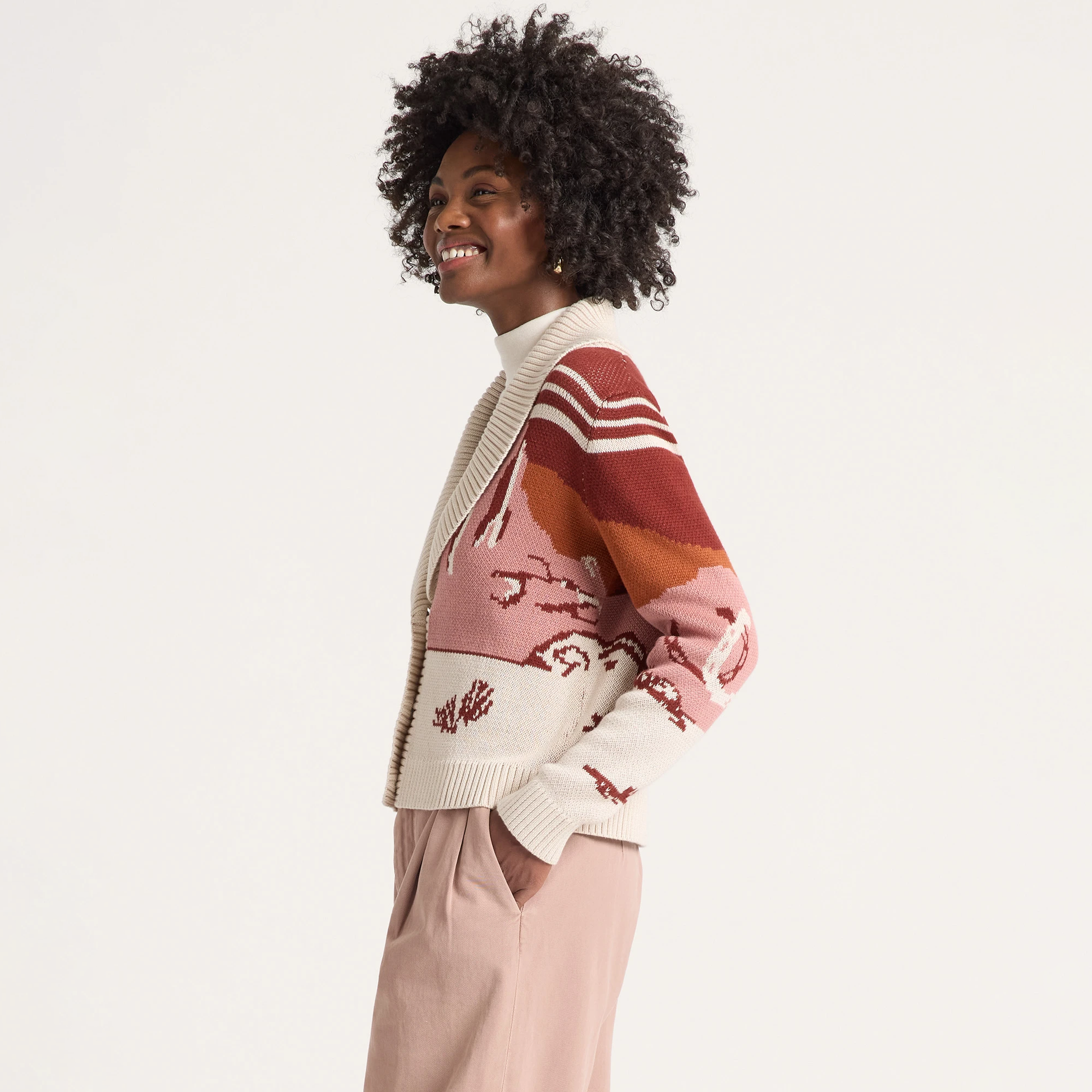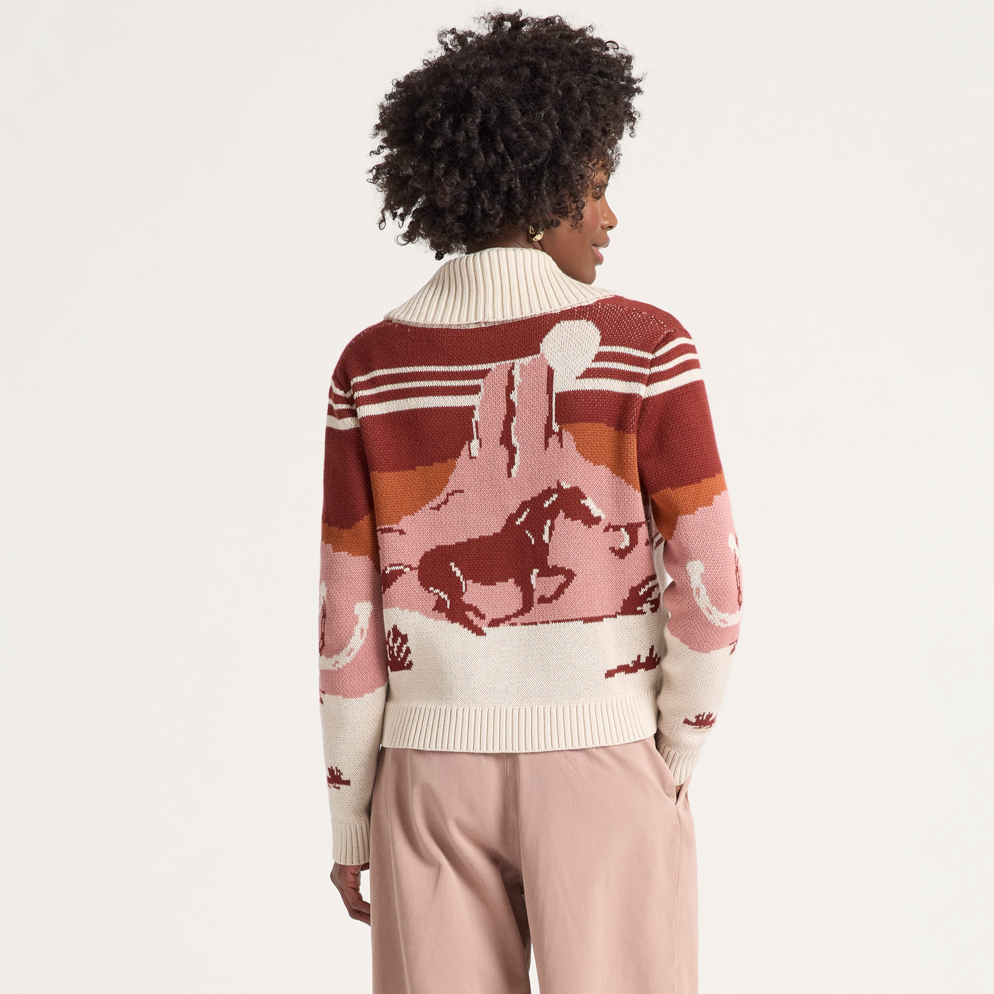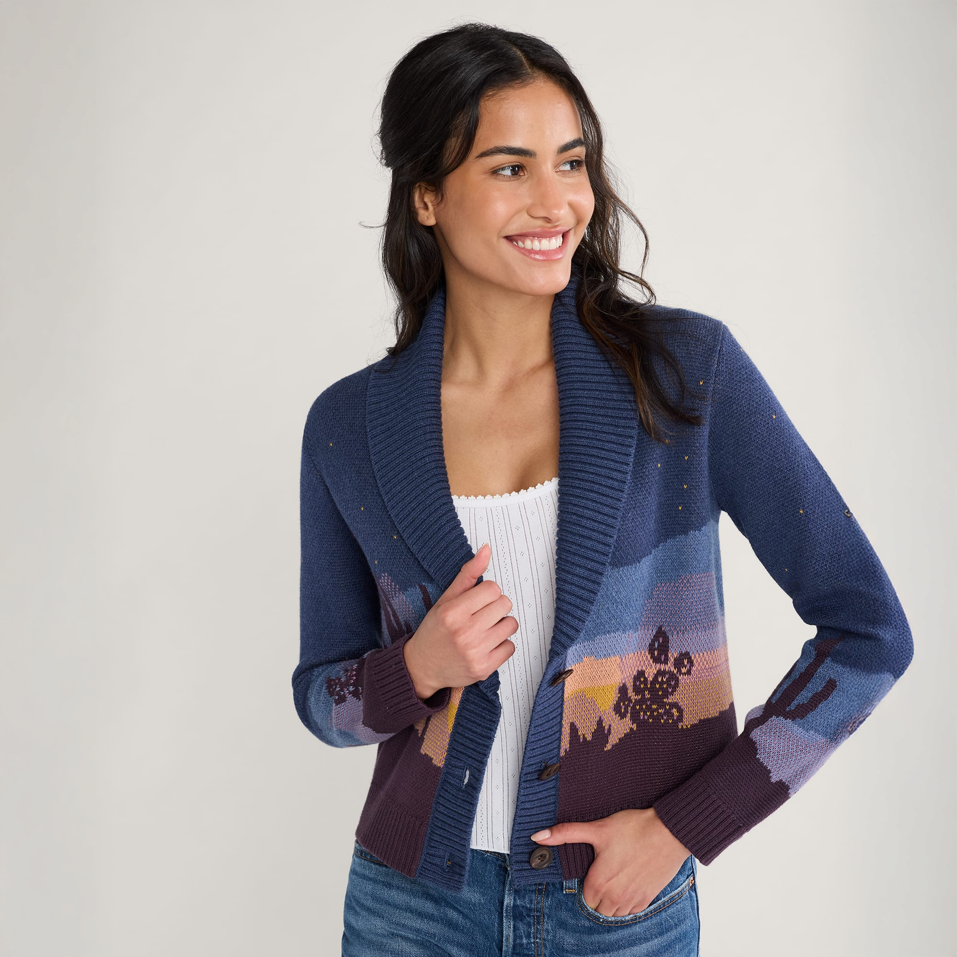 This women's cotton sweater features a desert scene at night, with cacti silhouetted against a dark starry sky. Beautifully executed continual design carries from front to sleeves to back. Ribbed shawl collar, and button placket.