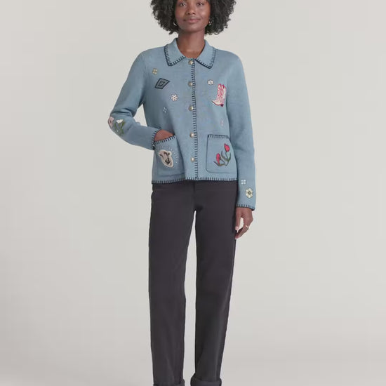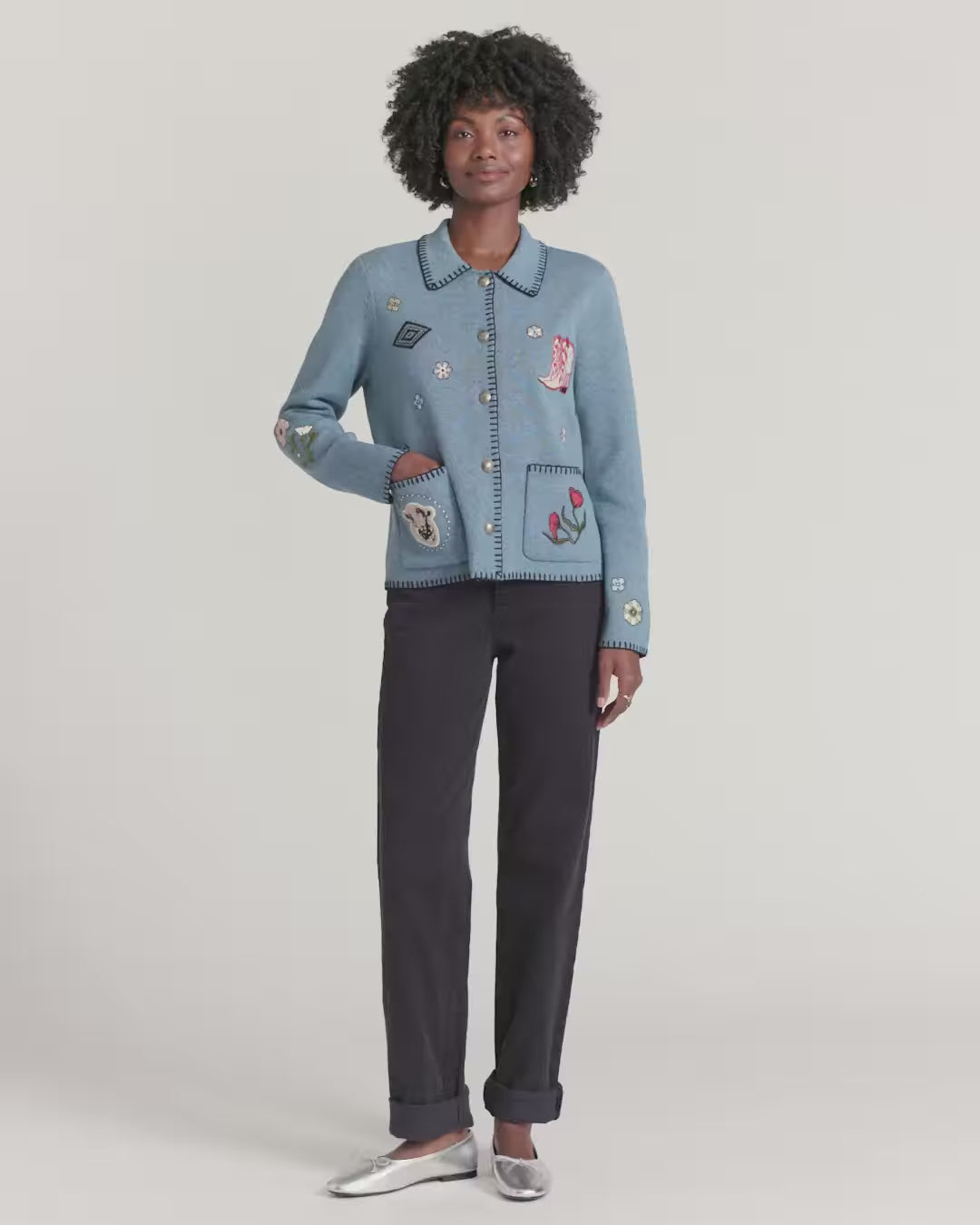 This souvenir cardigan is back with fun new appliquéd symbols of the West – boots, poppies, sheep, and more. With two patch pockets, a fold down collar, vintage-inspired silvertone novelty buttons, and contrasting whipstitch accents, this whimsical layer is classic and timeless.